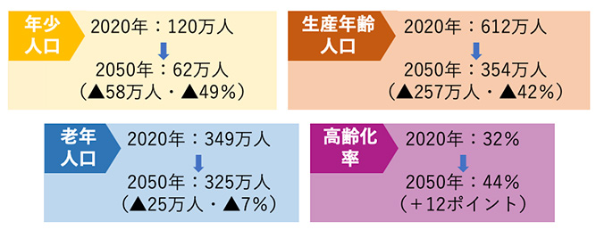 人口減少が続くなか、人口構造も大きく変化していく。年少人口(14歳以下)は2020年の120万人から2050年は62万人と49%(58万人)減少、生産年齢人口(15~64歳)も2020年の612万人(2020年)から2050年の354万人と42%(257万人)減少する見込みである。