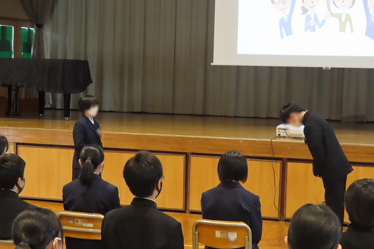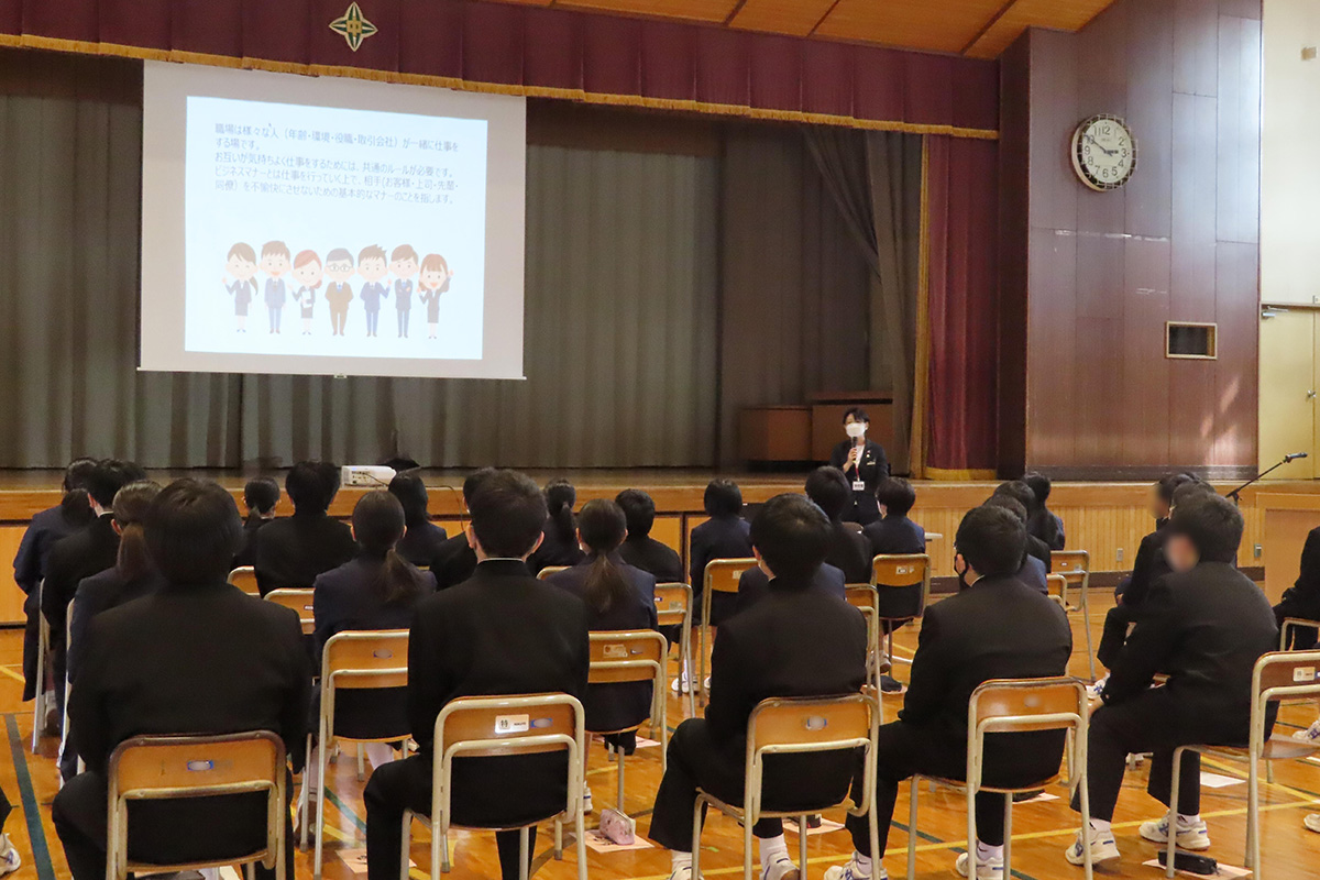 職場体験活動に向けて、立ち振る舞いや心構え、対人マナーを学び、コミュニケーション能力の向上を目指すことを目的に実施。ビジネスマナーとは仕事をする上で相手を不愉快にさせないためのマナーのことを指し、そのために必要な「身だしなみ」について、チェックリストを基に実際にお互いの身だしなみのチェックを行い、「挨拶」「お辞儀の仕方」については実践を交えて学習した。“分からないことがあれば必ず確認する”“間違いや失敗をした時には直ぐに報告する”など、職場での具体的な勤務態度やマナーについても学んだ。