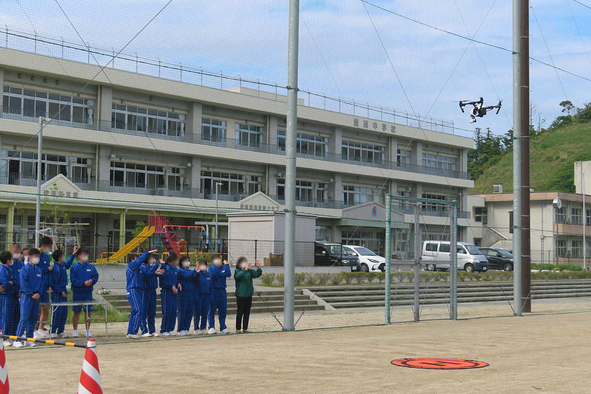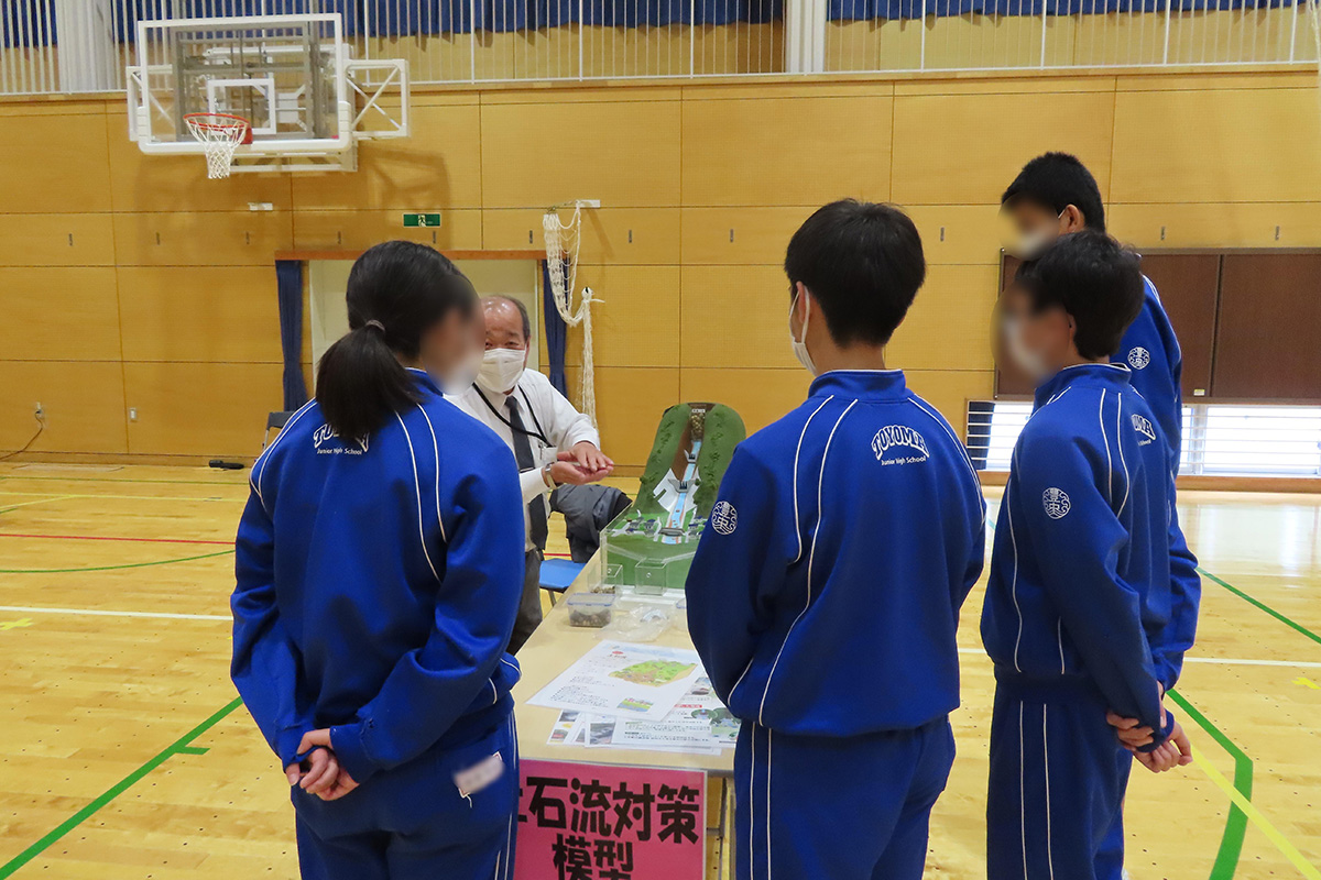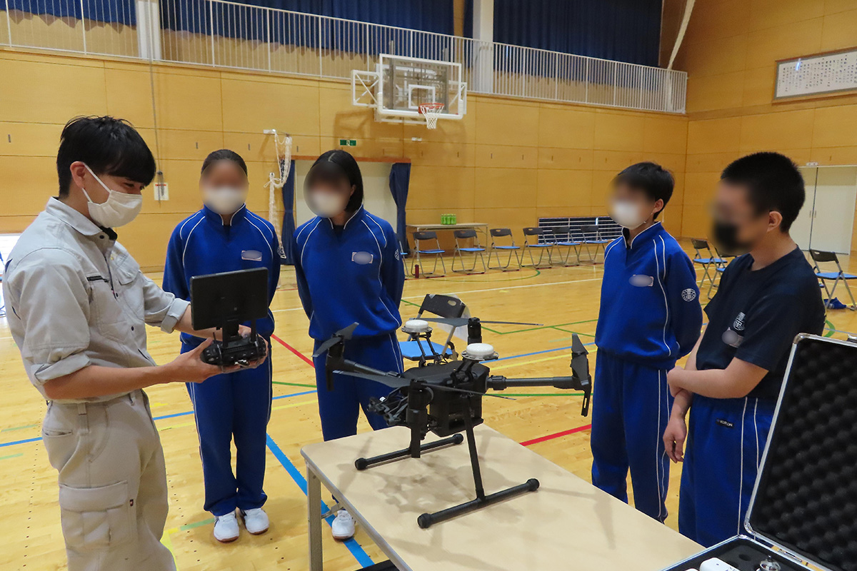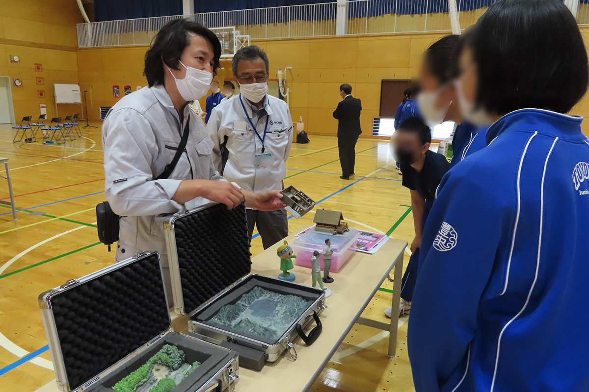 体験活動では、急傾斜地や土石流の様子について模型を通して学び、三次元模型がどのように作成されているのかを実際に手に取り確かめ、サーモグラフィーカメラの体験も行った。建築現場で実際に使用されているドローンの飛行の様子も見学した。