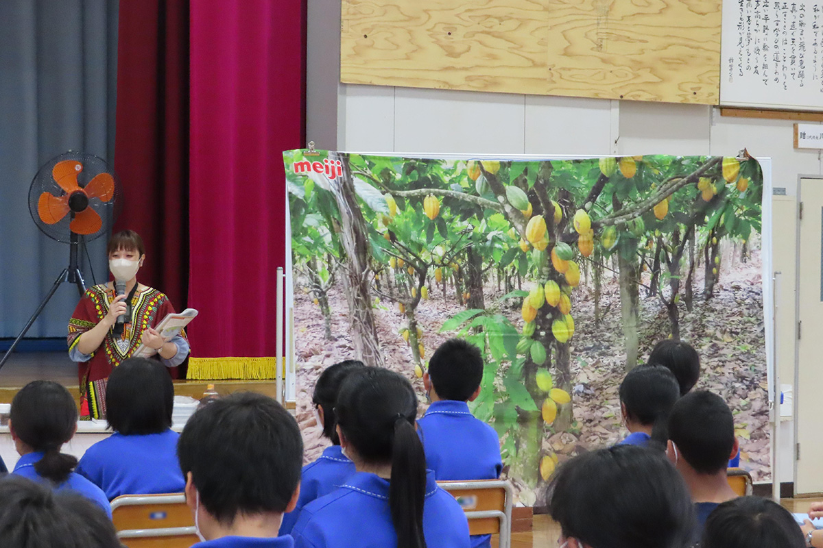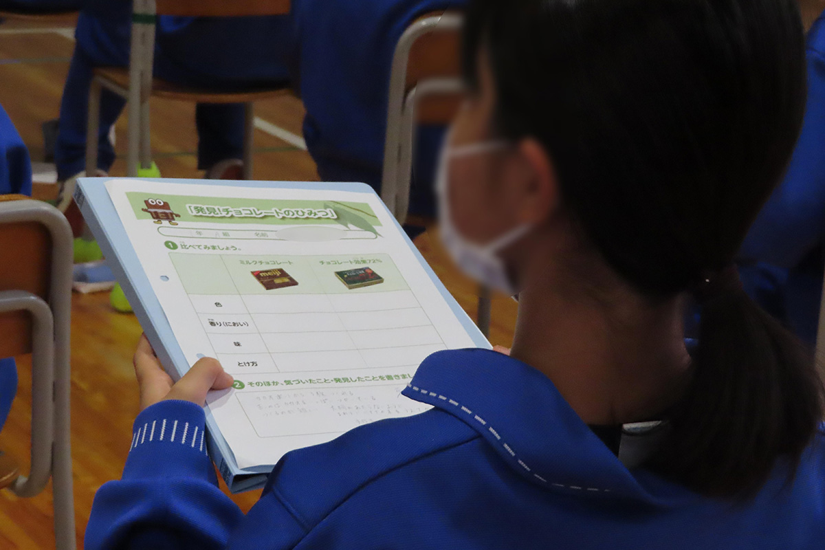 チョコレートの原料であるカカオや、そのカカオが出荷されるまでについて、クイズや動画を交えて学び、生のカカオ豆の香りも体験した。工場の様子をミニチュア版にまとめた動画を見ながらチョコレートが出来上がるまでの工程を学び、チョコレートの食べ比べ体験も行った。チョコレートの品質を向上するために、カカオ産地での明治の取り組みについても紹介した。