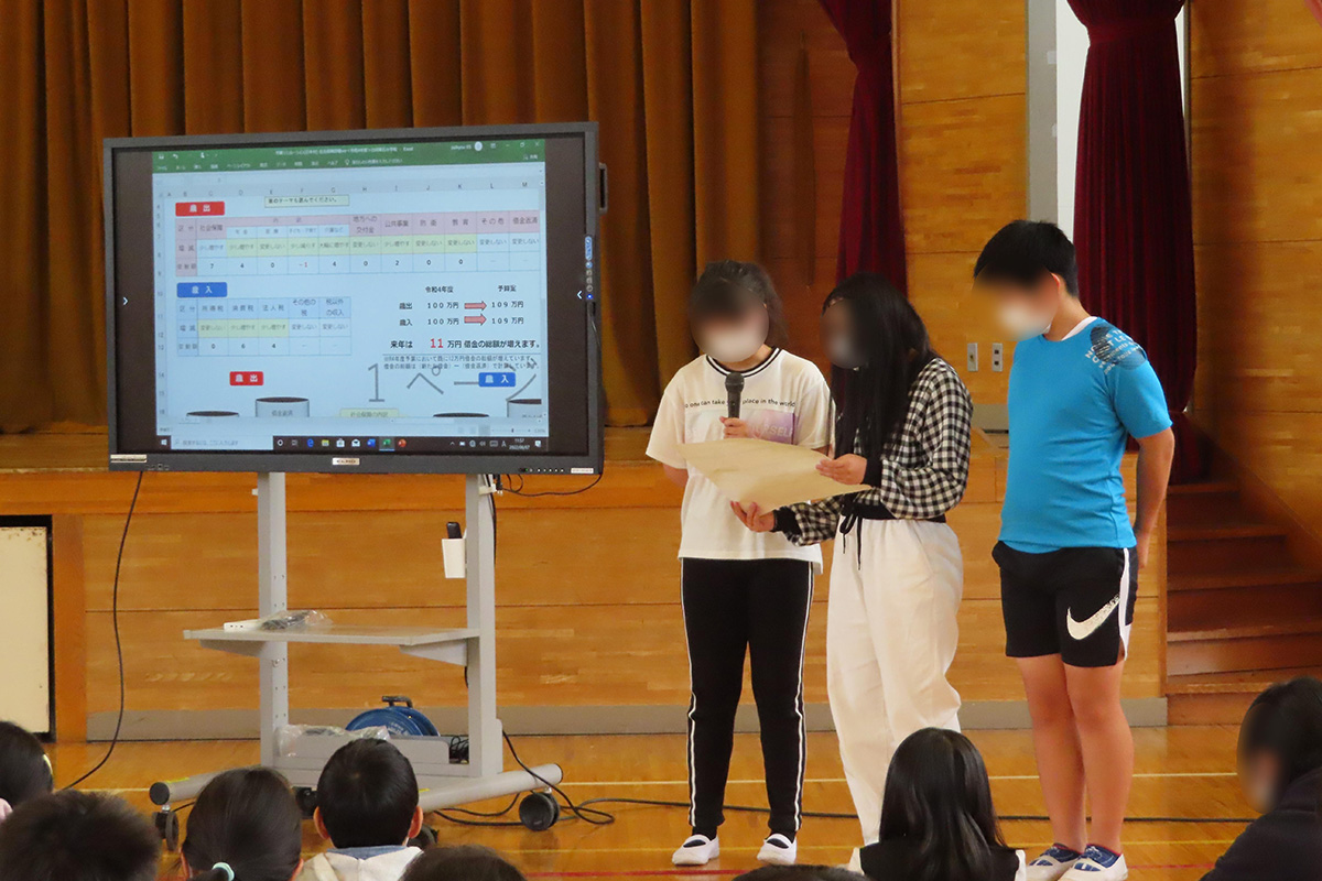 - みんなから集めたお金の使い道や、歳出・歳入など、自分が知らなかったことも新しく知れて楽しかったです。グループワークでは、グループの人と「日本村」の村人が安心して暮らせるような予算を話し合って決めたり、最後に発表をしてアドバイザーの方からアドバイスをもらったり、また新しい発見ができて面白かったです。