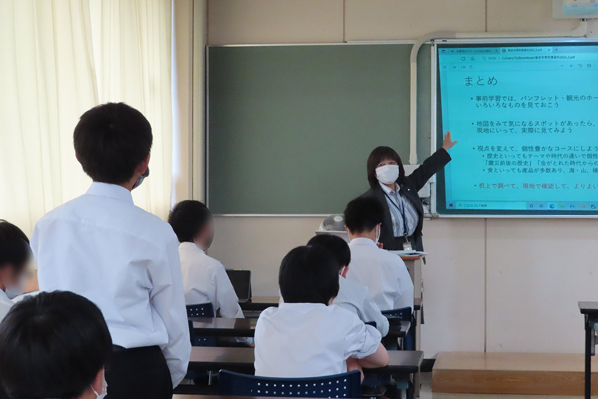 校外学習として「三陸ジオパーク」について学習した後、南三陸(釜石・大船渡・陸前高田)の観光ルートをグループごとに作成するにあたり実施。観光の大切さや地域資源活用の事例を学んだ後に、グループワークにて各自で探した現地の地域資源や観光資源を出し合った。地域資源から観光ルートをつくる際に、テーマを考えることの重要性や時間や距離についての注意点などを学び、最後にグループごとにテーマやルートを考え、それぞれの観光ルートを発表した。