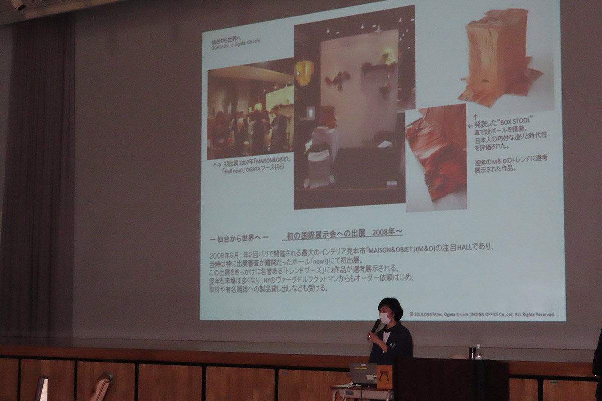 仙台から世界へ発信するだけではなく、世界から仙台に興味・関心を持ってもらうために様々な作品や取り組みについて紹介。講師がデザインしたオリジナルの家具を自由に触れることにより、家具の固定概念を取り払った。挫折からの目標達成、「好きなことはとことんやる」やり切って無理だと思った時はあきらめて(明らかに極めて)も良いこと、「好き」を仕事にするために起業(会社を設立)を決めたきっかけなど、講師自身の半生を振り返りながら物作りに行き着いた人生と物作りから得られた人生について話された。