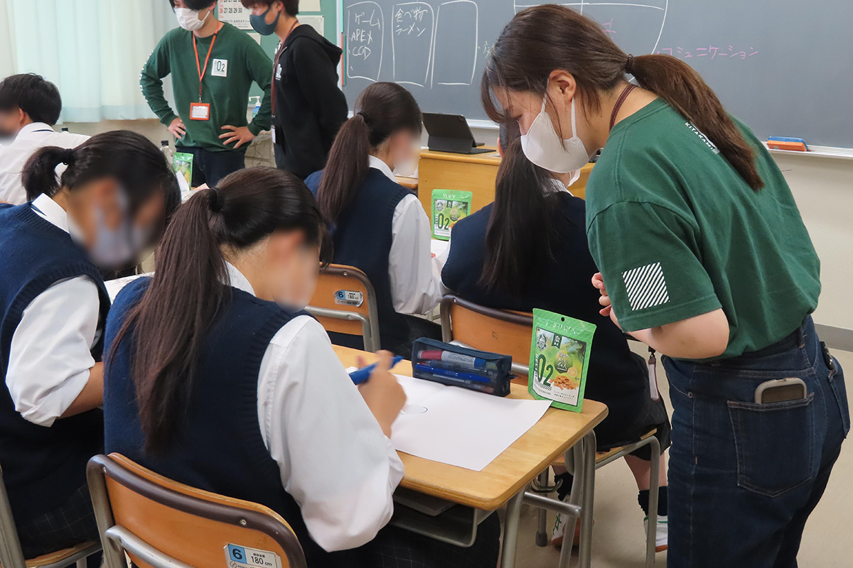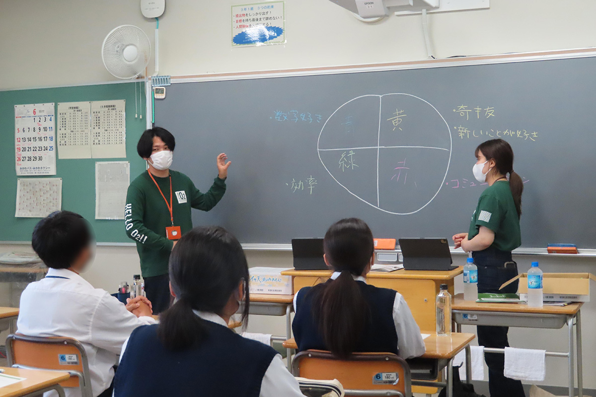 コミュニケーションの大切さを学び、自社で取り組んでいるコミュニケーションツールの一つである「マインドマップ」を作成した。用意された白紙の真ん中に自分の名前を記入した後、名前の周りに「好きなもの」「好きなこと」など、自身の「好き」にまつわるものを自由に書いていった。記入した中から「好きな食べ物」「好きなスポーツ」をそれぞれピックアップし、クラスメイトと共通しているものを探し出した。共通する「好き」があれば話をするきっかけとなりコミュニケーションが生まれることを、実践を通じて学んだ。