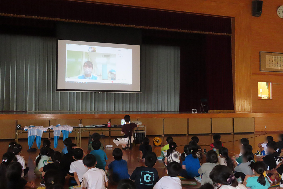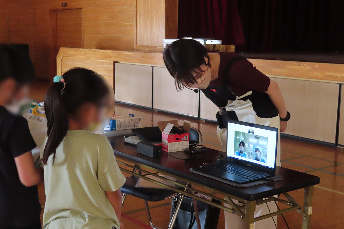 牛乳が出来上がるまでの工程や、安心・安全な牛乳をつくるために工場で働く人たちが気をつけていることを動画やクイズを通して学んだ。実際に牛乳が作られている明治の東北工場の見学をバーチャルで体験。外観の建物や牛乳が作られる様子までを見ながら、東北工場で1日に作られる牛乳の本数や、工場の大きさのクイズを行った。最後に東北工場で実際に働いている方とオンラインで繋がり、質問をしながら牛乳や工場についての話を伺った。