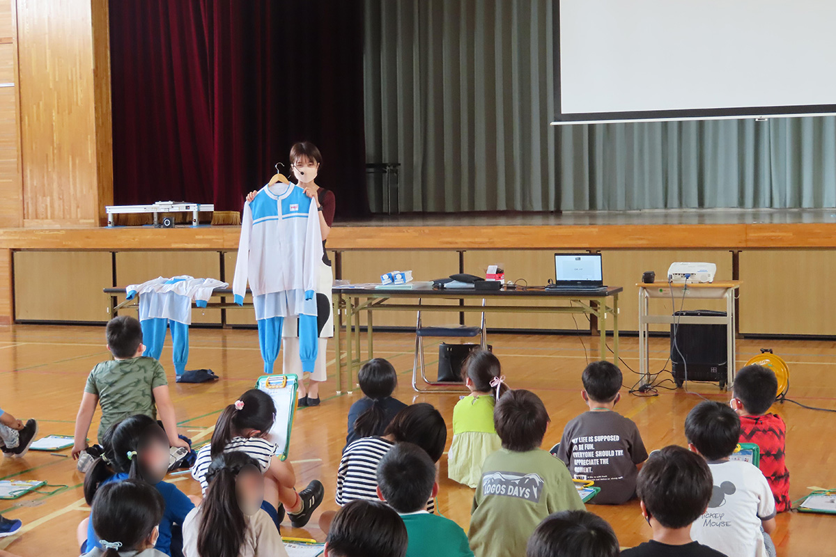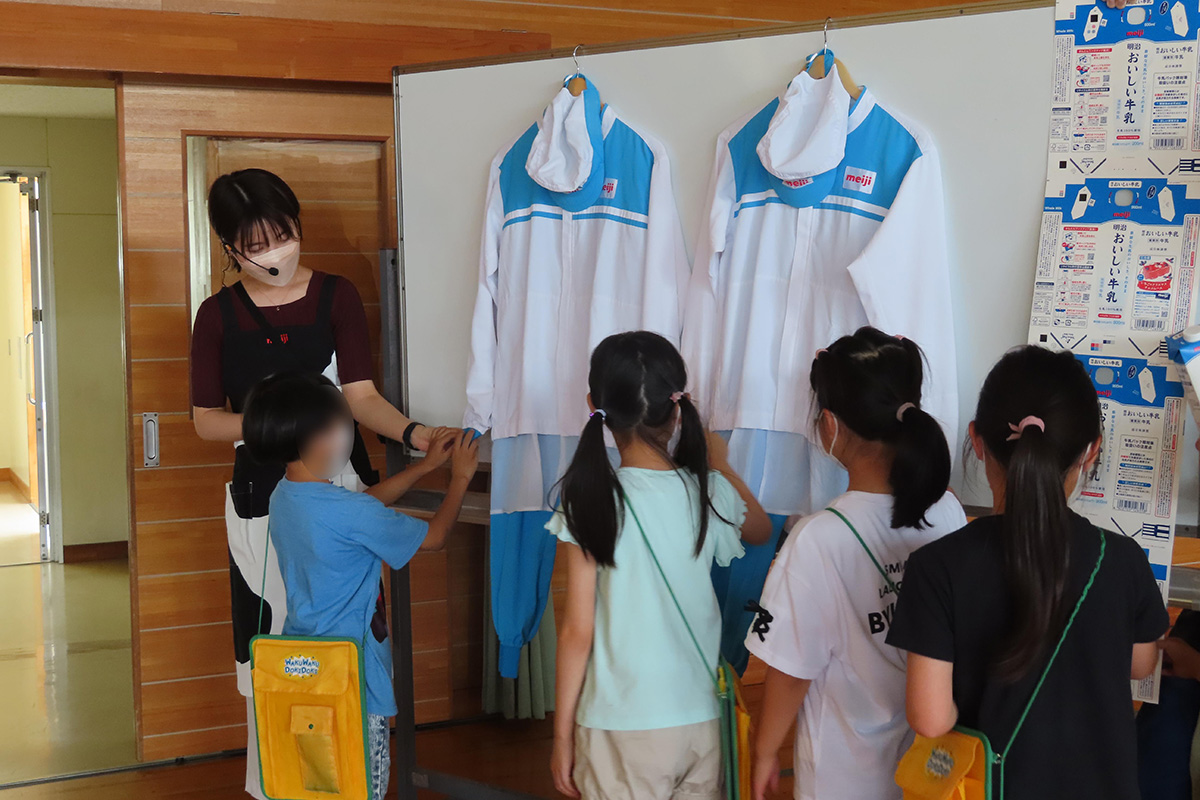 - 一番べん強になったのは、作る人が着ているそざいや、牛にゅうパックです。どちらもつるつるしていて、作る人の着ている服はポケットもなく、手くびはフィットしているのにおどろきました。
