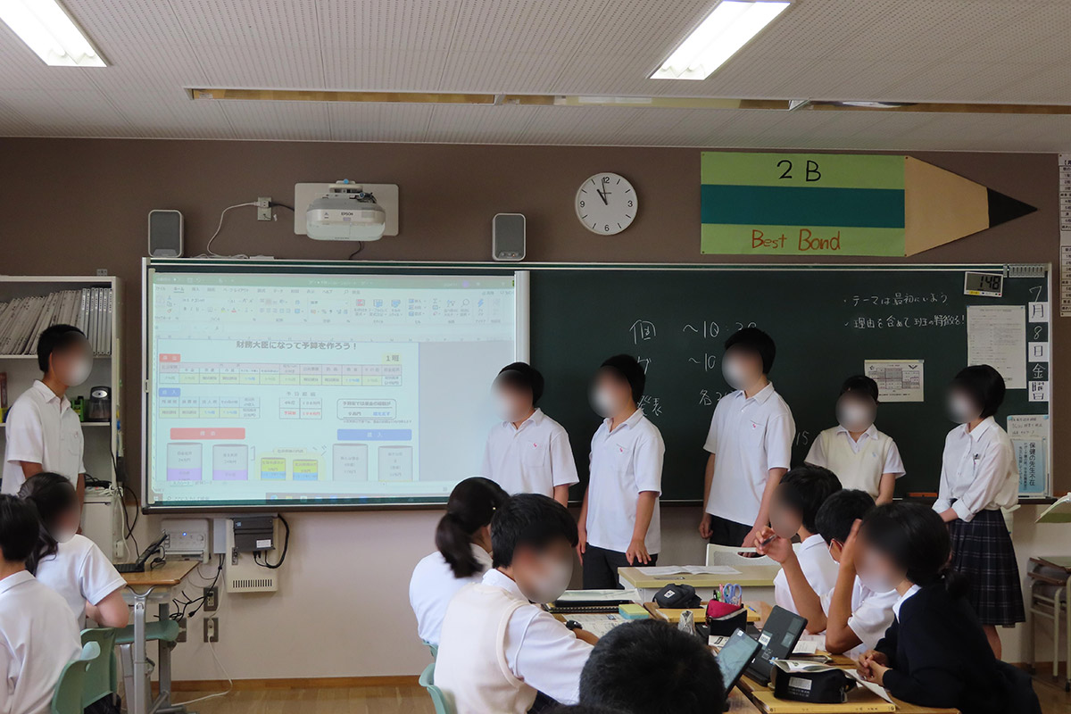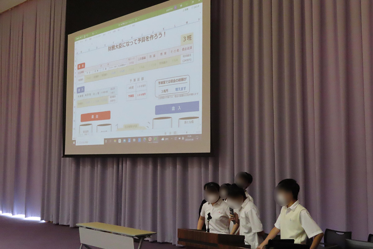 - 実際に予算を考えてみると、上げたいところを上げると借金が増えすぎてしまったり、歳入をその分上げようとすると収入が減ったりして暮らしにくくなるなど、うまく予算を考えられず難しかった。でもグループワークをすることで、違う考え方を知り、工夫の仕方など人によって違うため、1人で考えるより計画的に考えることができた。