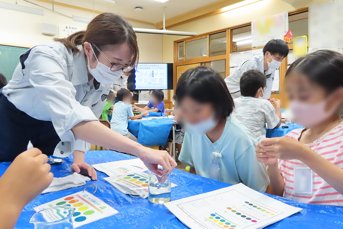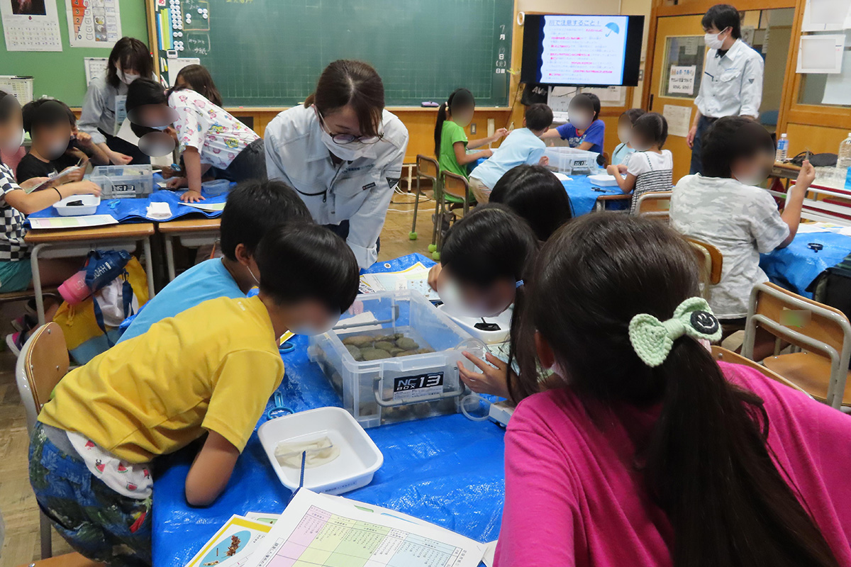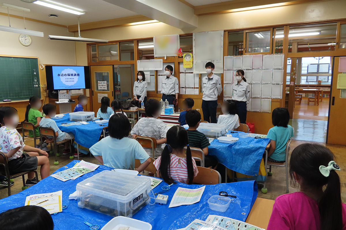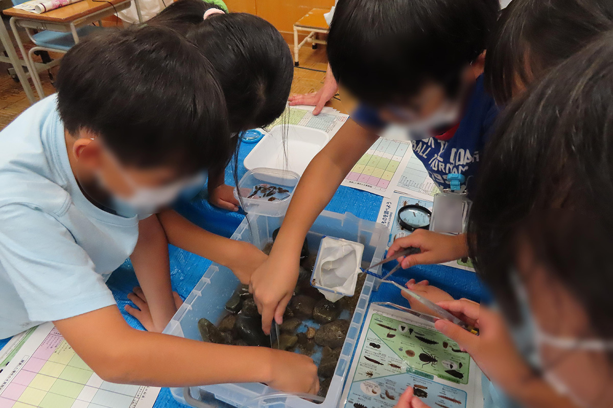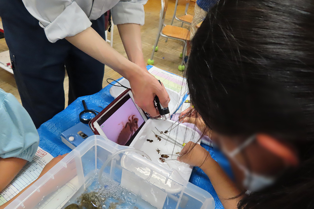 同校周辺の水辺環境について、試薬による分析と生き物の生息状況の両面から確認し、自然環境の保全の大切さを学ぶために実施。同校近くの登川河川公園から採取し、園芸用コンテナに移した水生生物を捕獲し、ルーペや電子顕微鏡で観察しながら捕獲した水生生物の種類や数などを調査した。また、水生生物の捕獲場所等で採水した水を簡易水質検査キットで検査し、色の変化からpH等の数値を記録した。捕獲した水生生物の結果と簡易水質検査の結果から川の水質を評価し、グループ毎に発表した。