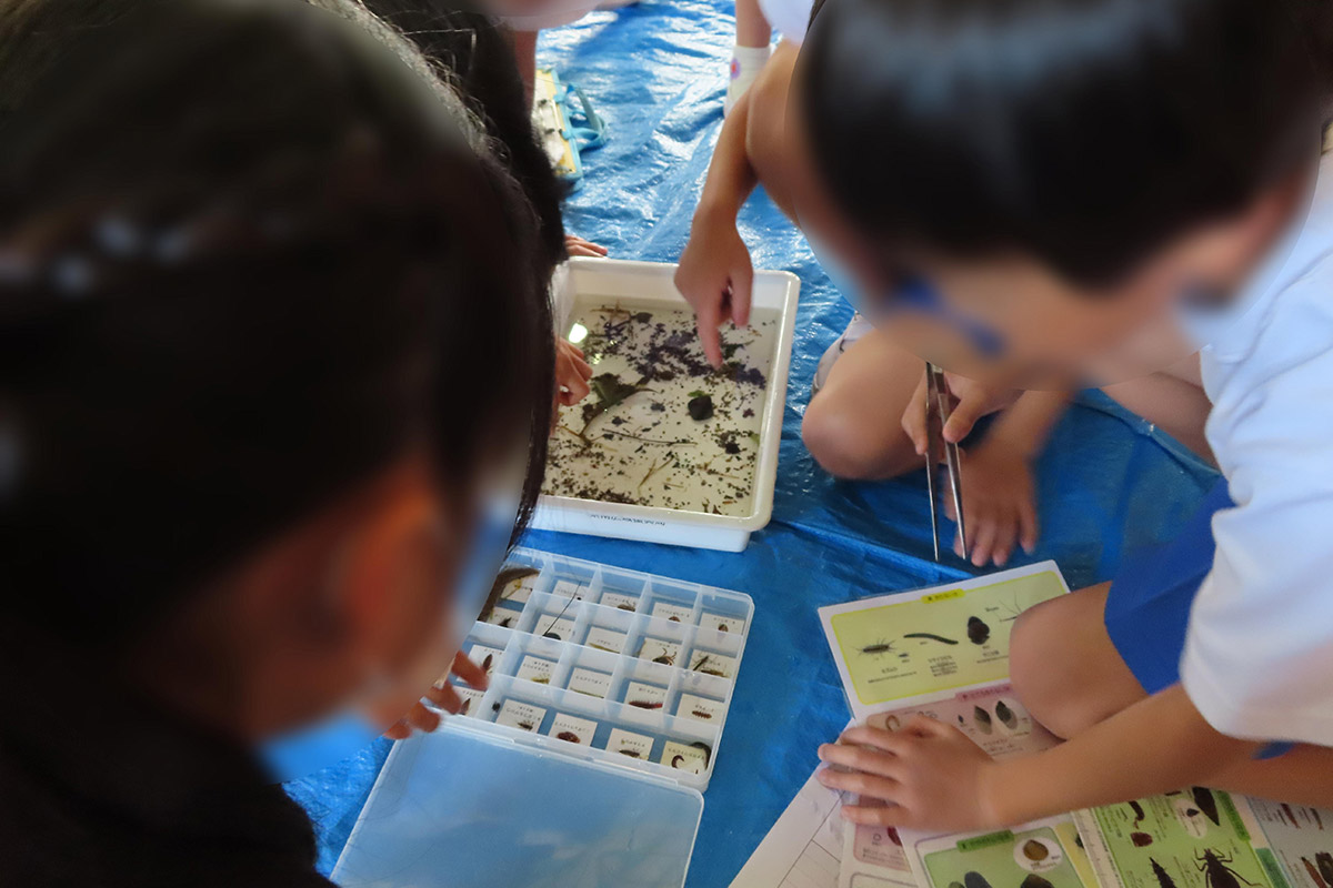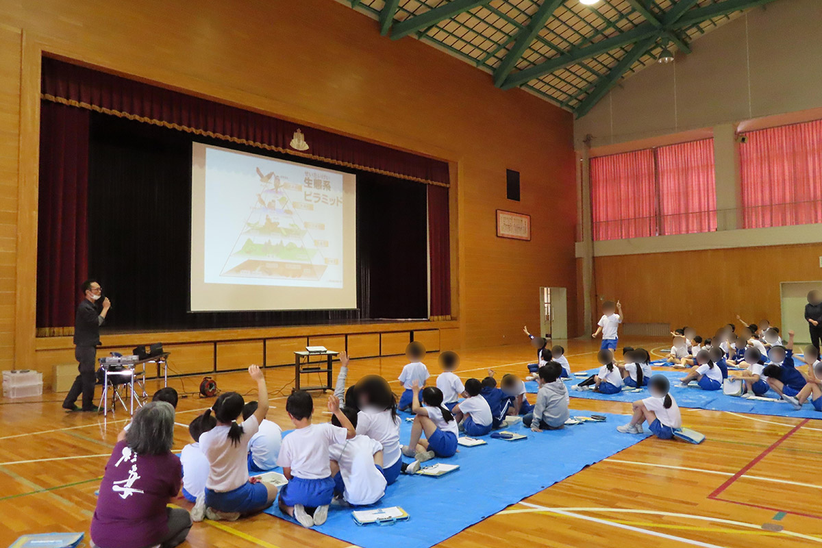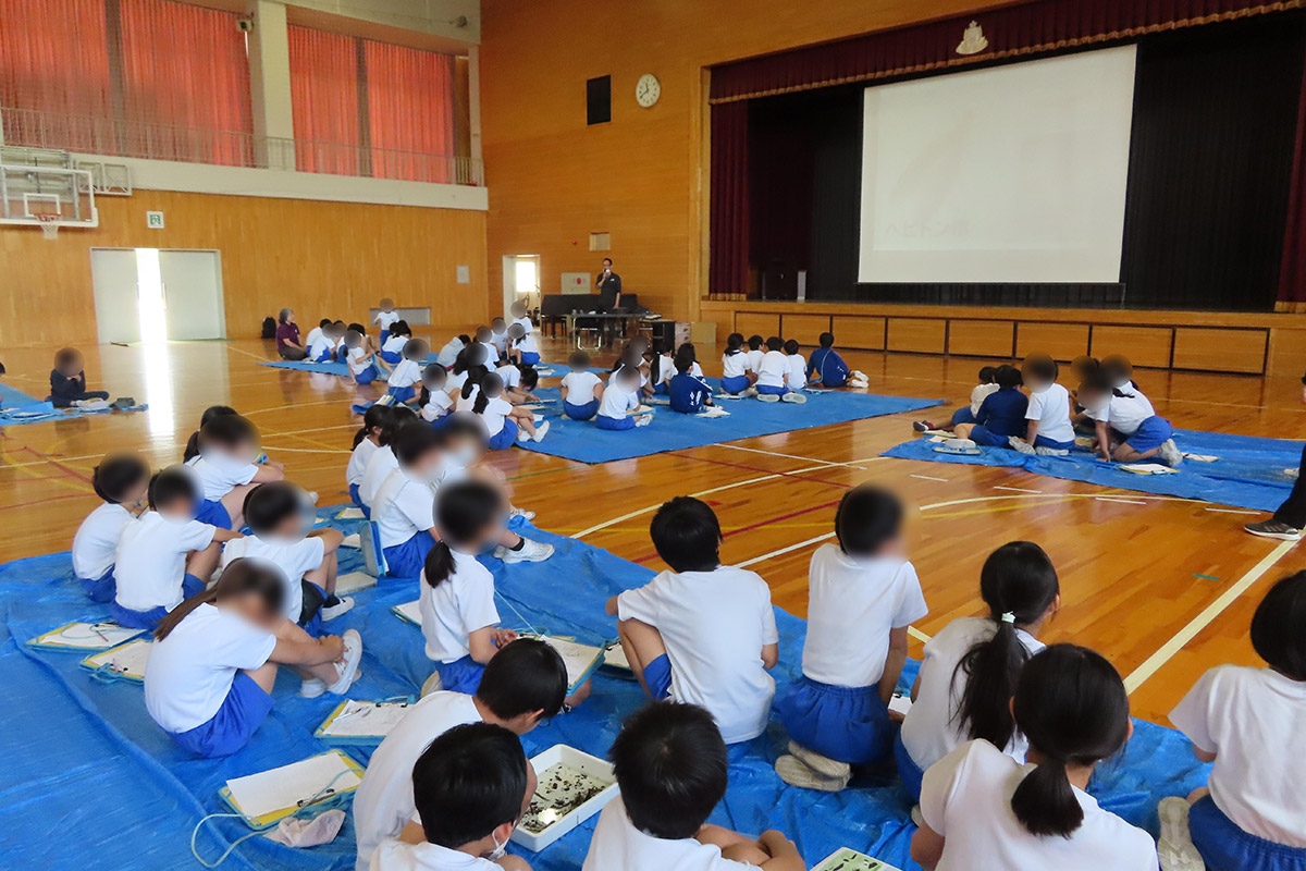 海洋プラスチックの問題や環境問題について講義を実施。地球温暖化の原因や、温暖化が進むと猛暑・集中豪雨・台風などの気候変動が起こり、将来的には海面上昇や食料・水不足、生態系の損失など様々な事象が起こってしまうことについて学習し、地球温暖化を防ぐために自分たちに出来ることについて考えた。身近な川の水生生物調査の体験を通して、全ての生き物は自分たちが気付かない場所で繋がっていることや、人間は自然の一部であり、自然を知り、自然と仲良くなることの大切さを話された。
