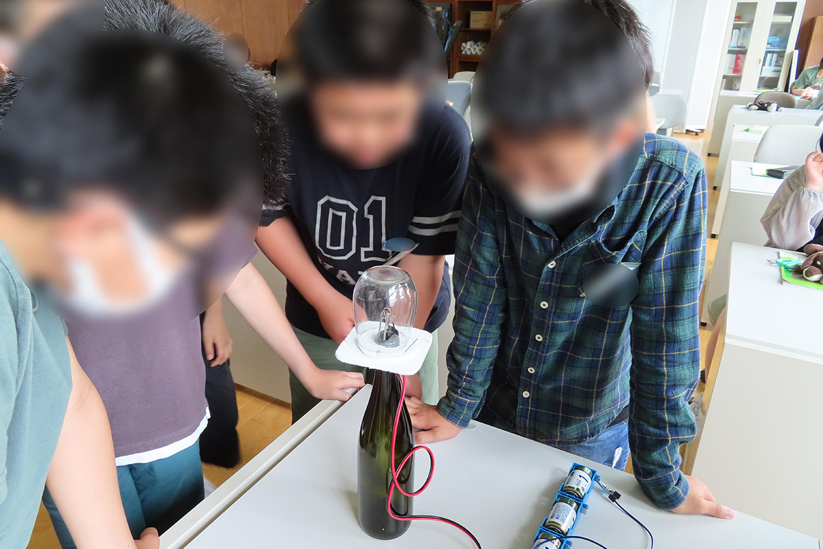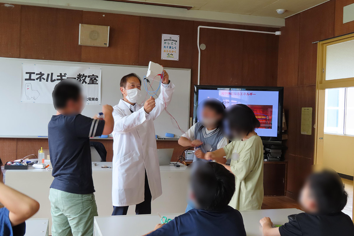 エネルギーの歴史や電気を作るとはどんなことなのか、電気は動力・熱になるエネルギーや光になるエネルギーがあること、発電所の仕組みや家庭まで電気が届く道のりについて学習した。地球温暖化はどのような影響を及ぼすのか、また、再生可能エネルギーや電気に関わるSDGsを通して、家庭で電気を上手に使うためにはどのようにすればよいかを考えた。風車を回して蓄電したモーターカーを走らせてみたり、「手回し発電機」を組み立て、LEDの点灯や電子オルゴールを鳴らしたりしながら、モーターを回転させることで発電できることを理解した。