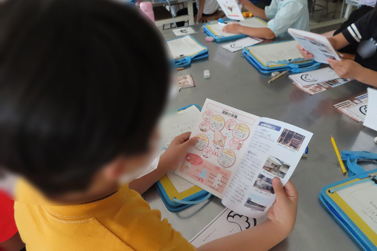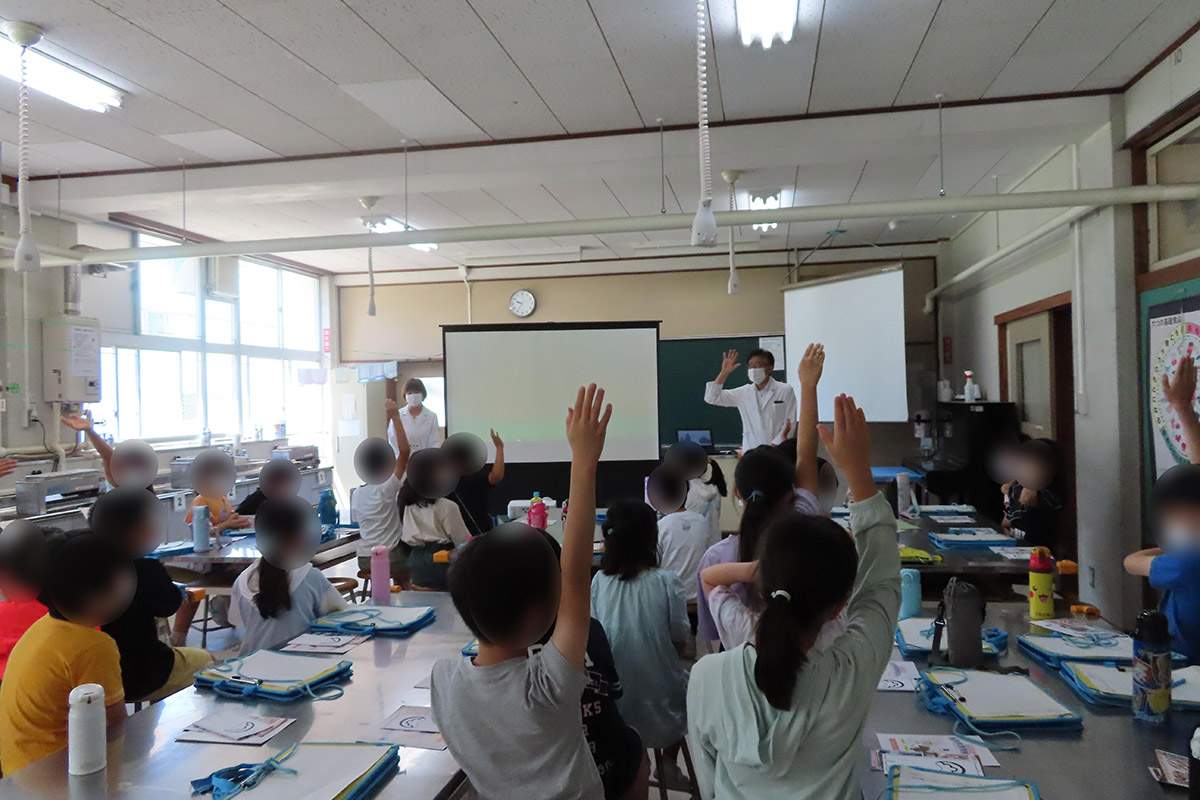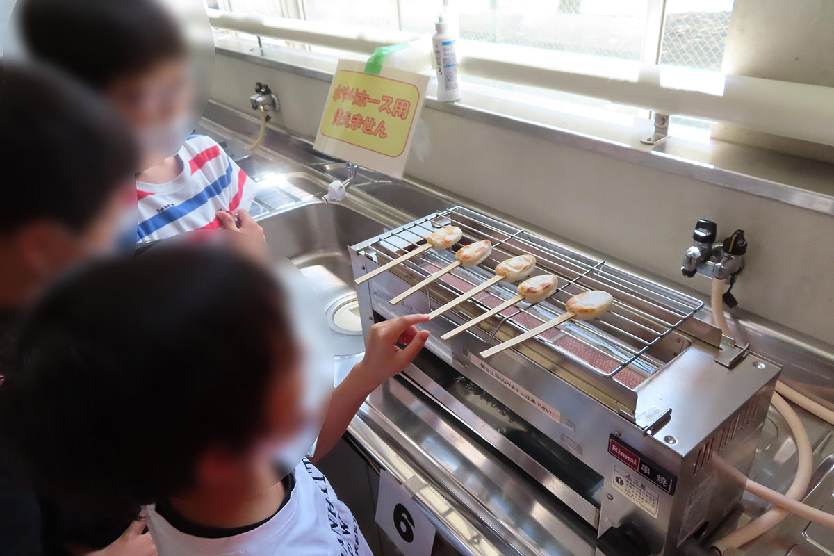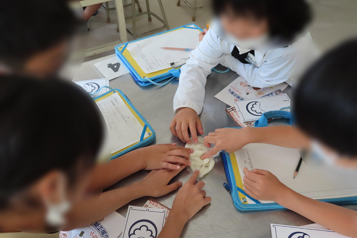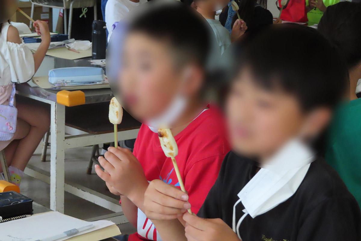 かまぼこの歴史や笹かまぼこの原料となるスケトウダラについて詳しく解説。スケトウダラの漁獲の様子や、すり身にするまでの工程の様子を、動画などを交えて学んだ。実際に「すり身を凍らせたもの」と「すり身に材料を入れ、練って柔らかくしたもの」に触れて、硬さや弾力を確かめた。手造り体験では、笹かまぼこを実際に焼いて試食。笹かまぼこにはタンパク質が多く含まれていることなど、栄養についても学んだ。