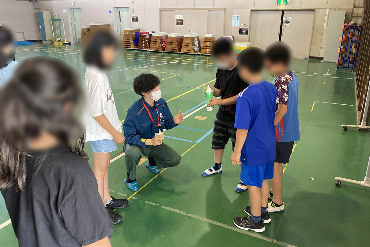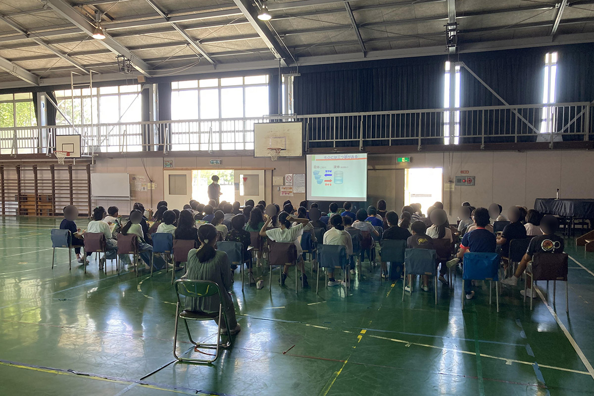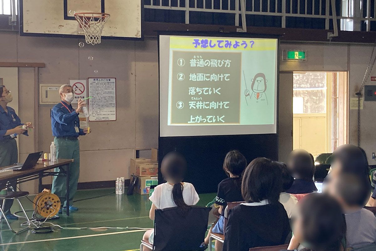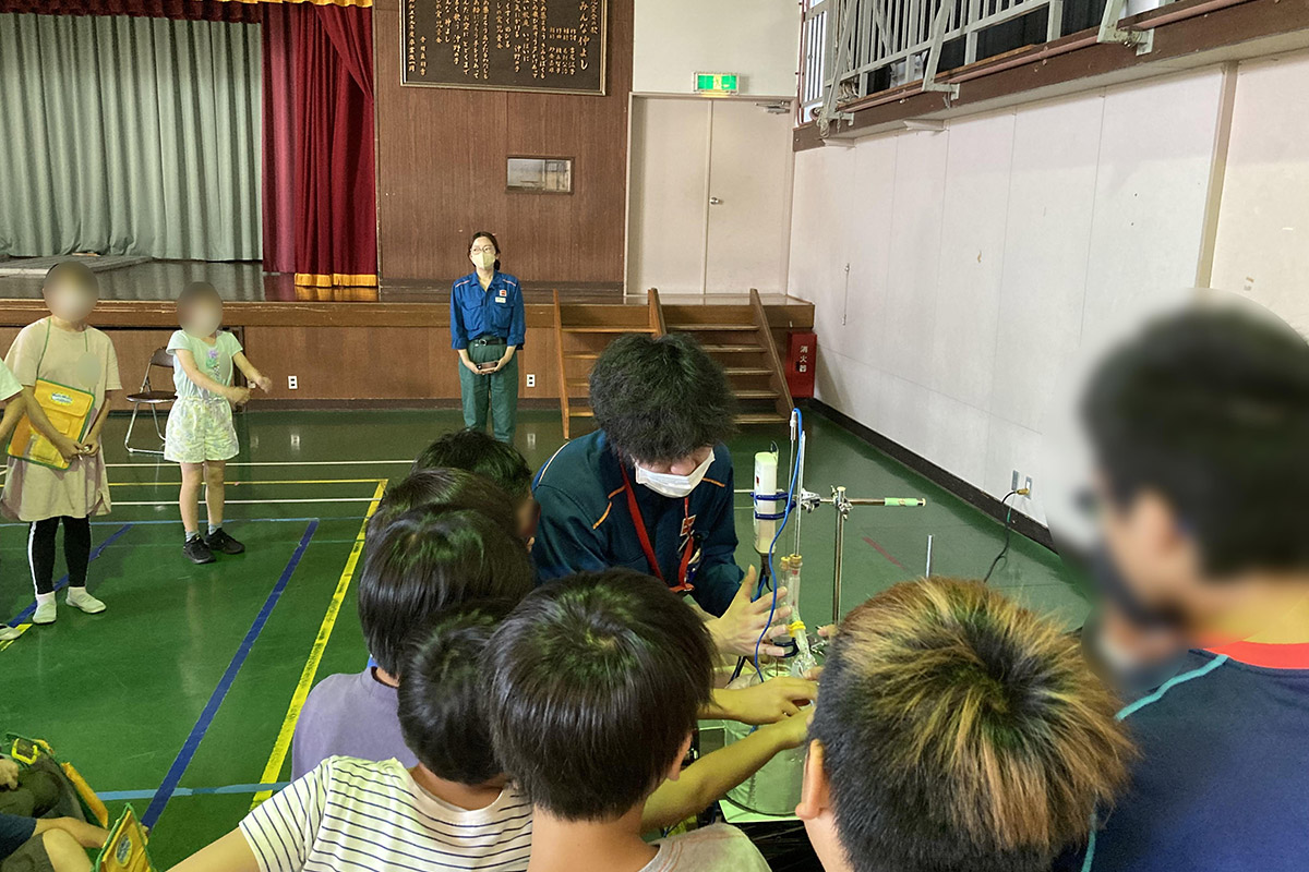 石油を原料として、レジ袋やペットボトル、フリース、アスファルトなど様々な製品が作られていることや、燃料としてガソリンや灯油などに使われていることなど、石油は私たちの暮らしの身近なものであることを学習した。また、重油や軽油など様々な原油と製品の見比べも行った。クイズを通して、主な国の石油の消費量を知ると共に、蒸留の様子を実際に見ることによって、原油から石油製品を作る仕組みを理解した。環境について、地球温暖化を防ぐために私たちに出来ることは何かを考え、二酸化炭素を出さない燃料電池と水素エネルギーについて学んだ。二酸化炭素と水素の違いを理解しながら、水素しゃぼん玉の燃焼実験も行った。