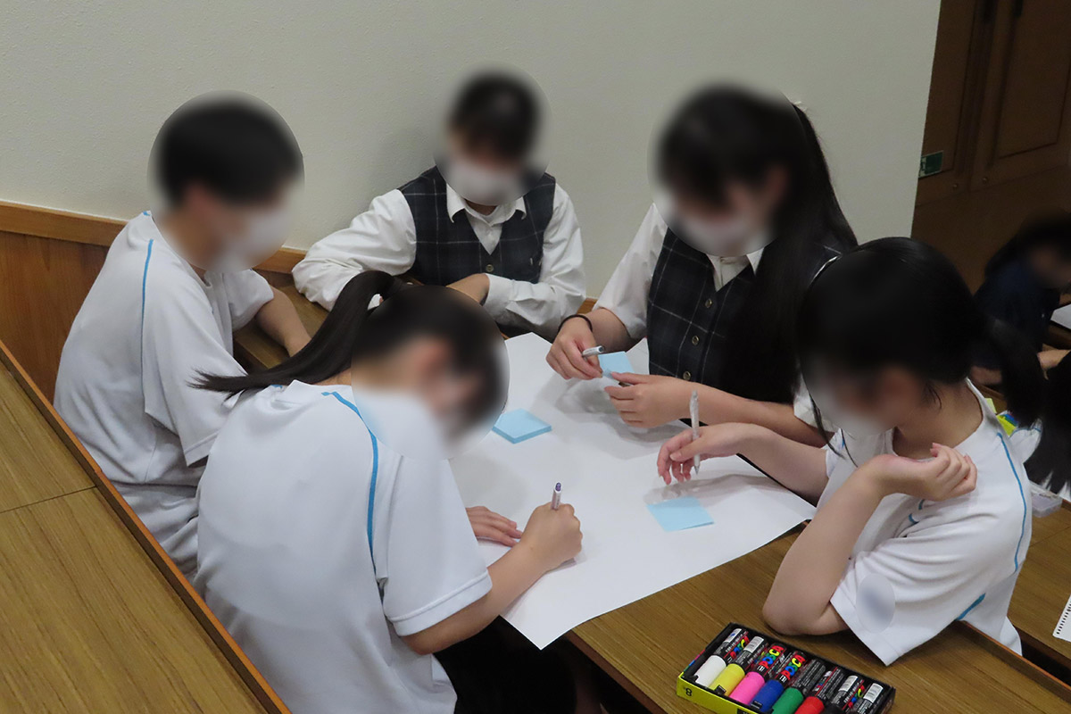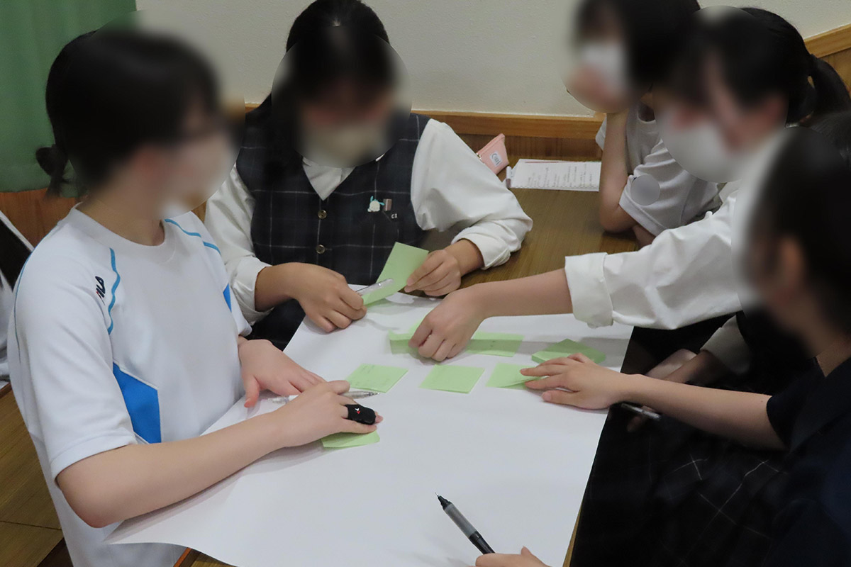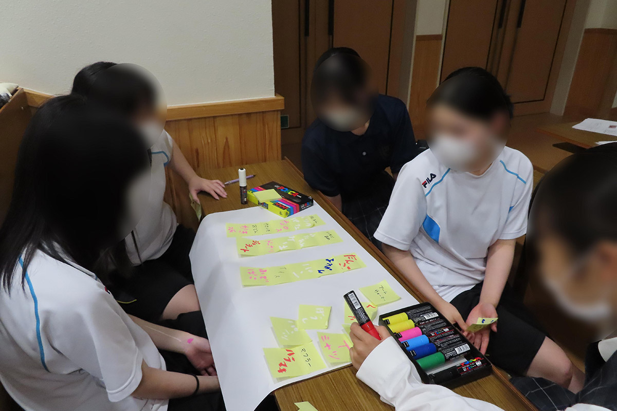 身近な人はどのような仕事をしているかについて書き出し、その仕事の共通点についてグループ毎に話し合った。働き方には会社や団体に所属して仕事する場合や、自分で会社や団体を設立して仕事をする(起業)方法があることを学び、ないたりもの・就きたい職業をあらゆる面から見て、できることや苦手なこと、興味があることや好きなことについて将来につながる自分の力を掘り下げた。文化祭で出したい商品をグループ毎に書き出し、一番売りたい商品を一つに絞り発表した。