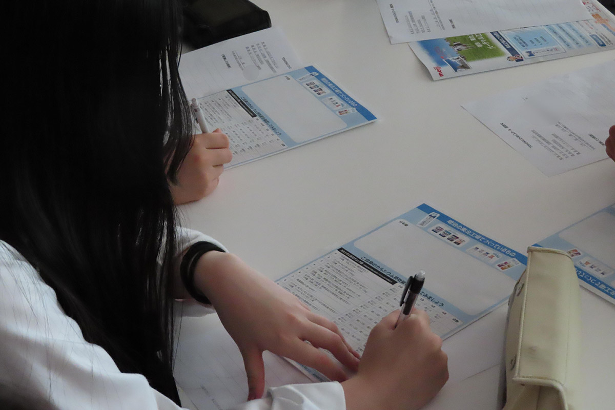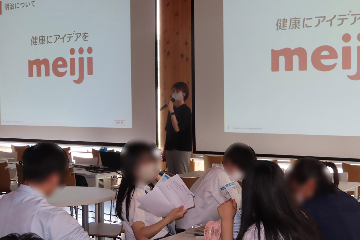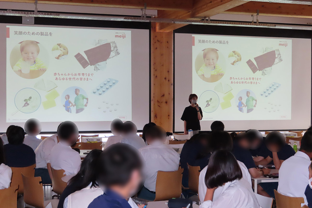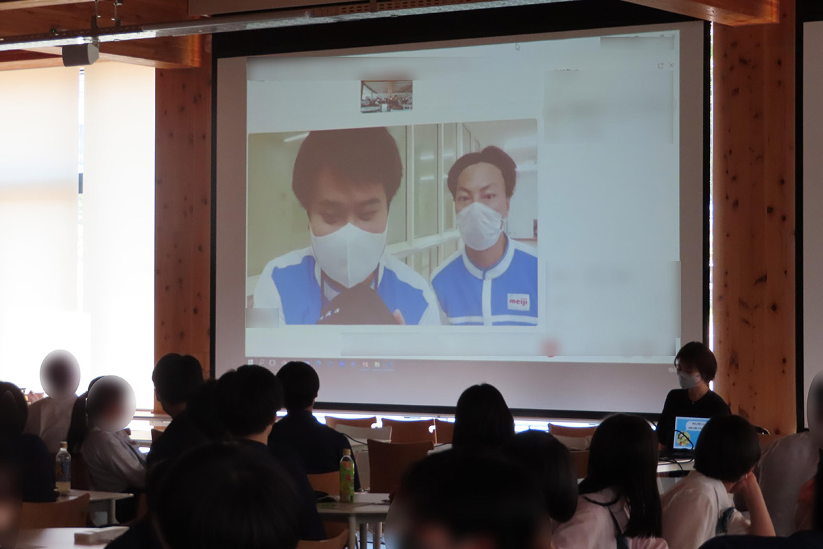企業紹介として、株式会社明治のグループ体制や商品カテゴリー、働く人の特徴などについて話を伺った。また、管理栄養士の資格を持つ講師の仕事内容を詳しく伺うとともに、社会に出て仕事を選択する際に「様々な業種を調べてみる」「大学進学は将来の選択肢を広げる一つの手段である」「家族・友人・先生と情報交換をしてみる」ことを学んだ。宮城県の工場とオンラインでつなぎ、工場で働く社員の仕事内容ややりがいについても伺った。