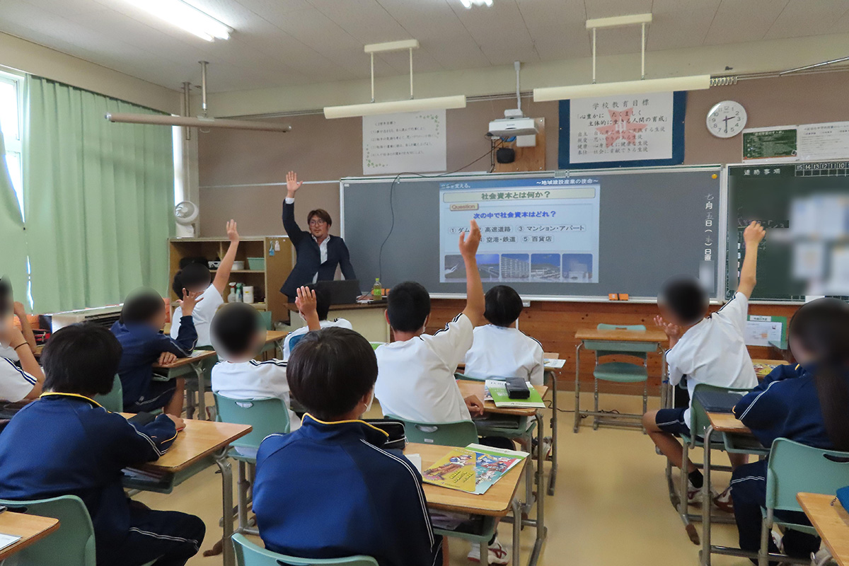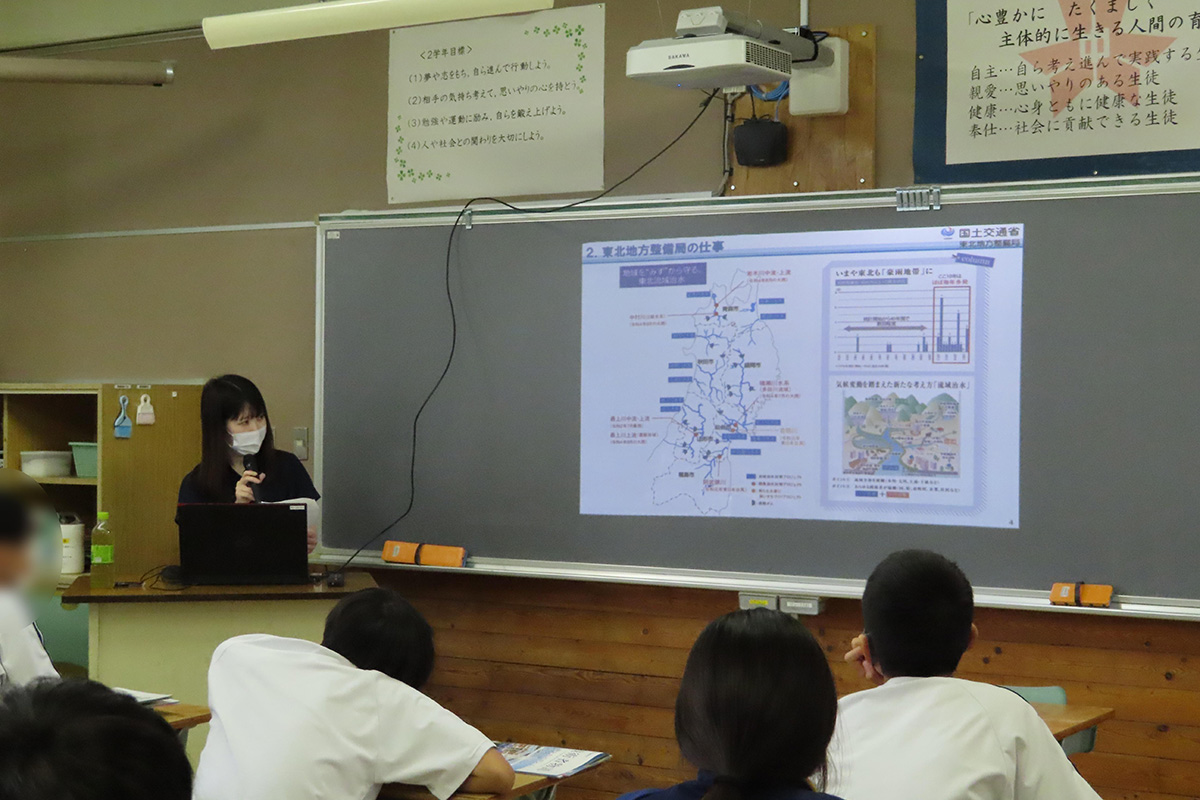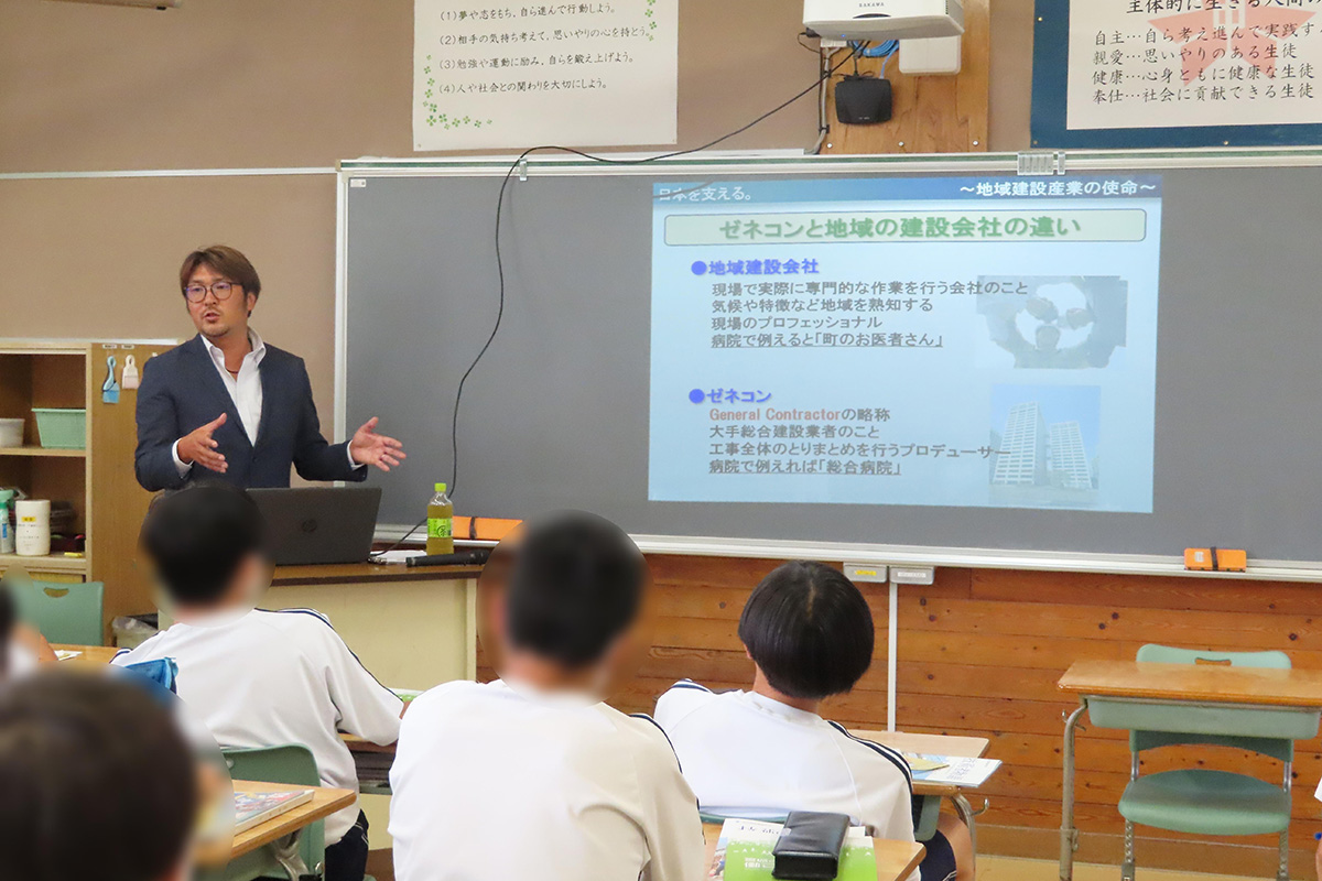 建設業の仕事は「土木」と「建築」の二つに分かれ、日常生活や身の回りにある沢山の土木や建築の仕事などについてクイズを交えながら理解した。建設に関わる人たちや建物ができるまでの工程を学び、建設業では多くの女性が活躍していることや海外で活躍する日本の技能者、建設業における日本の最先端技術についても話を伺った。また、ゼネコンと地域の建設会社の違いや、地域建設業は人命救助・救援・復旧に貢献するなど地域の重要な役割を担っていることも学んだ。