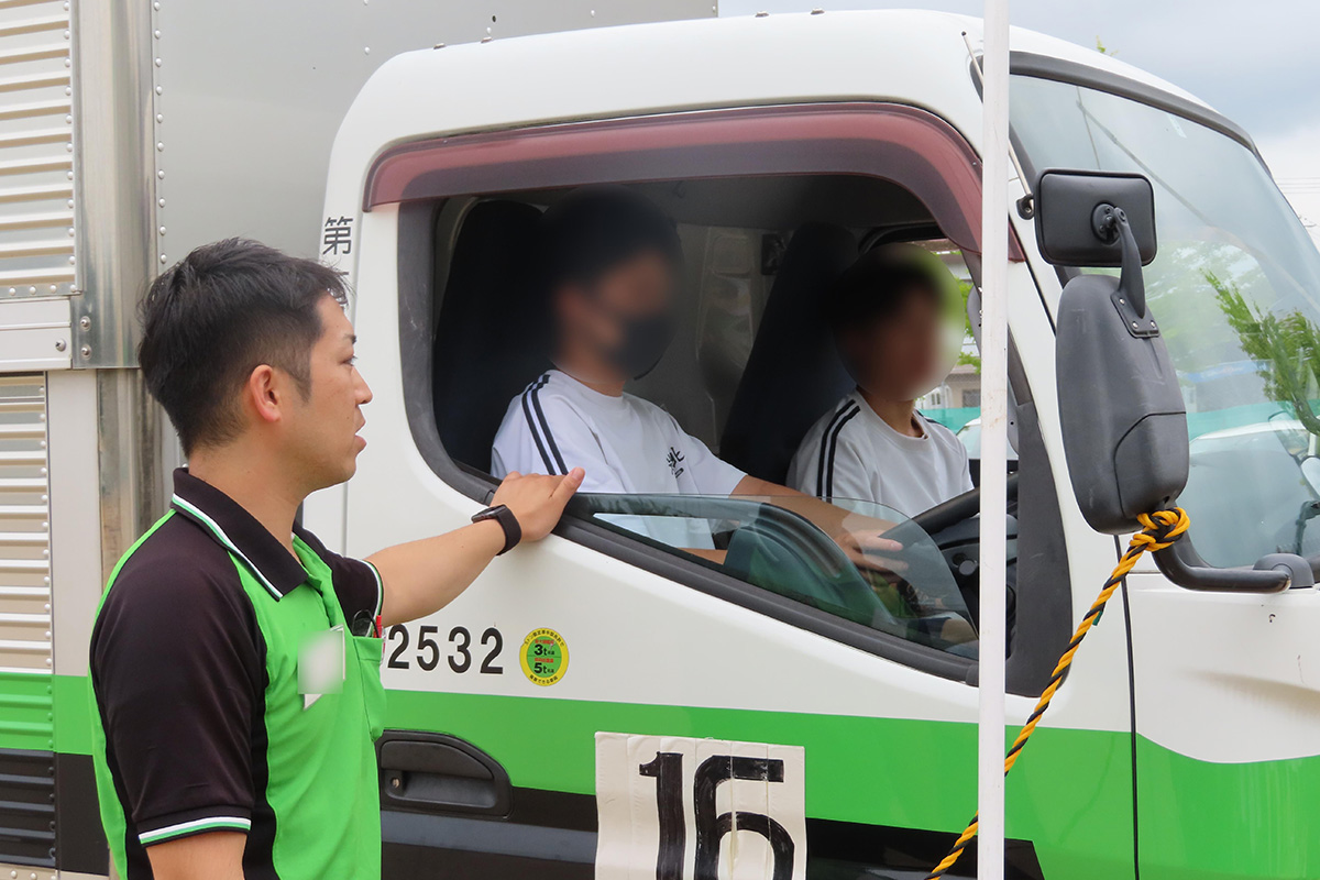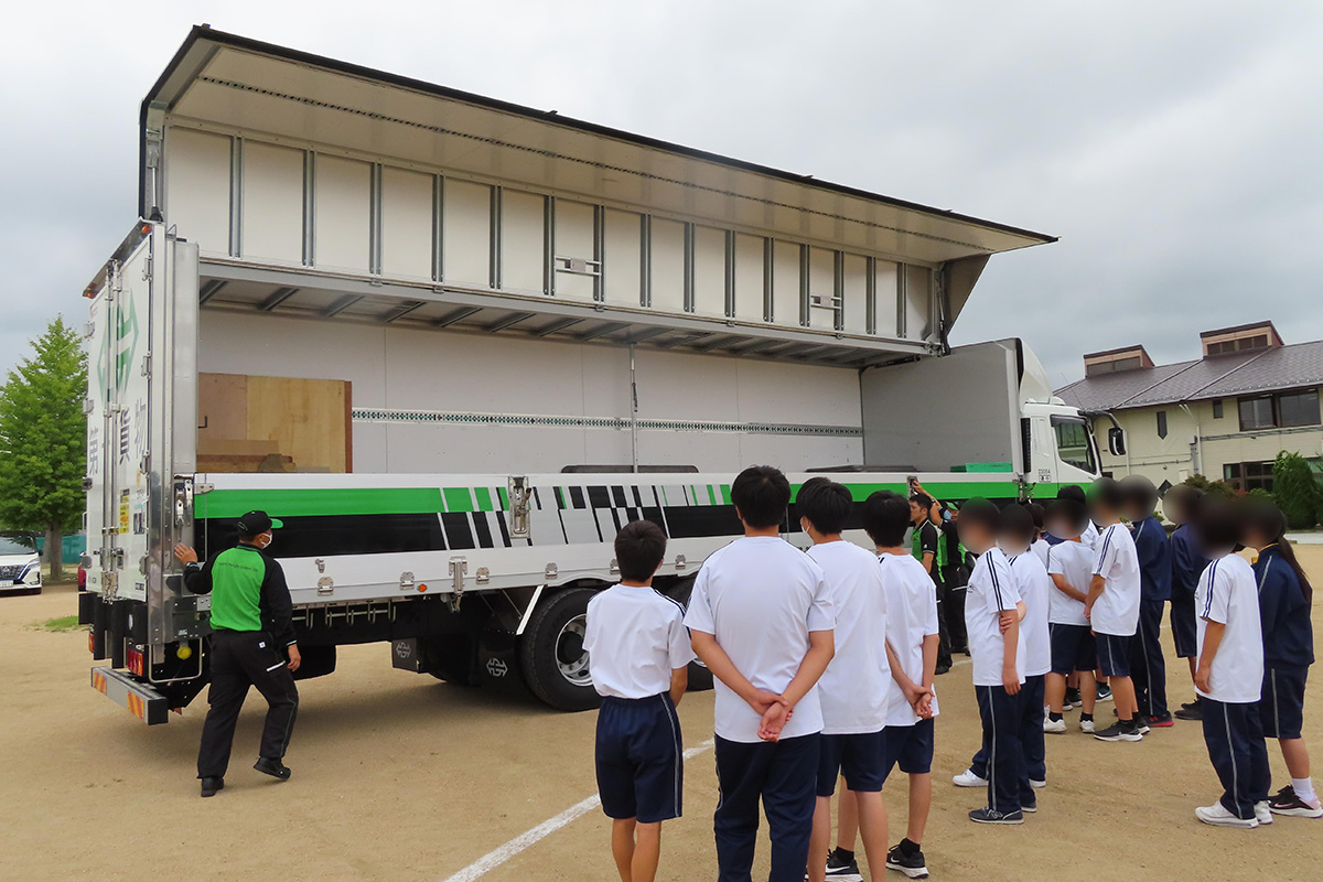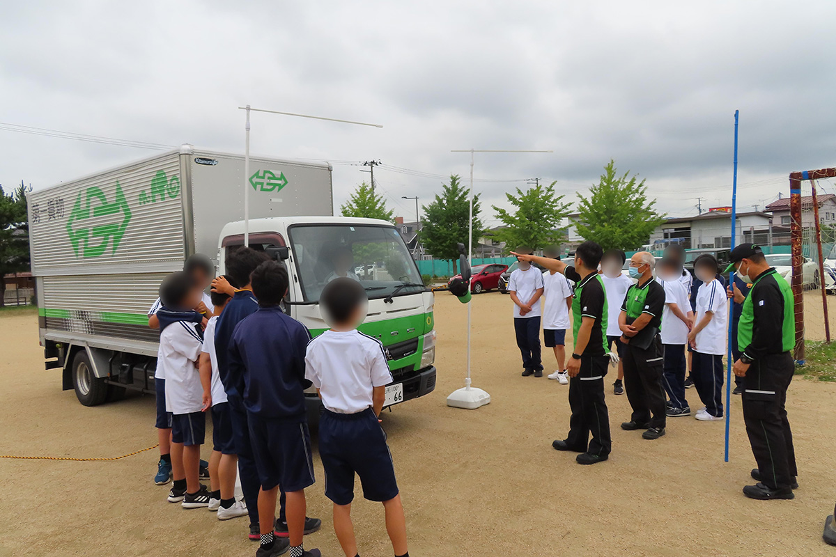 社会生活は経済活動(生産・販売)と暮らし(衣・食・住)で成り立っており、その中でも物流は社会の当たり前を支える役割を担っていることや存在意義、物流の流れ、物流に携わる職種やそれぞれの業務内容について詳しく学んだ。体験学習ではトラックの荷台の高さを調整する様子やウィング車の動きや構造について見学し、荷物を安心・安全に運ぶための工夫について理解した。トラックの試乗体験では、運転席から目視できる範囲の確認などを行った。