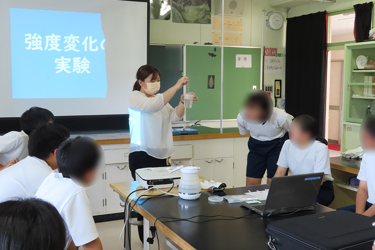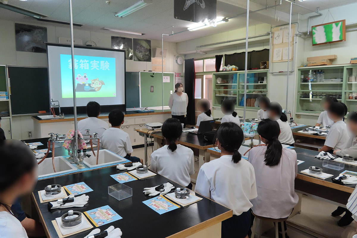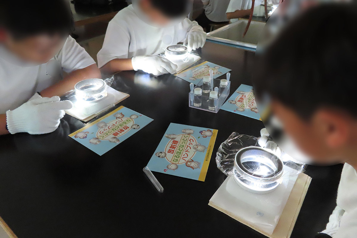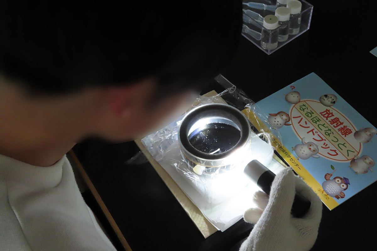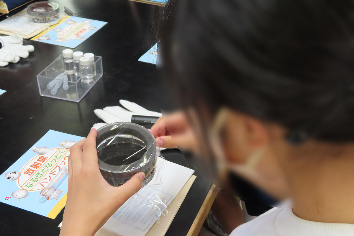 霧箱を使用して放射線の飛跡(主にα線)を目視で確認し、空気・食べ物・大地・宇宙など自然の放射性物質は身の回りにあるため日頃から放射線を受けて生活していることや、「放射性物質」「放射線」「放射能」それぞれの違いを正しく理解した。また、放射線の単位や種類のほか、放射線を受けた時の人体への影響を数値ごとに学んだ。普段の生活において放射線が身近なところで利用されていることを、プラスチックを使用した強度変化の実験(架橋反応)を通して理解した。
