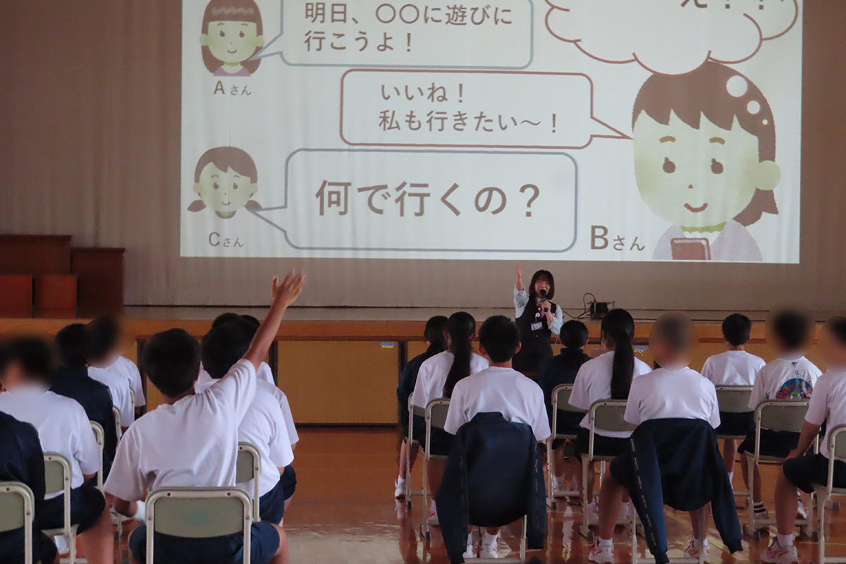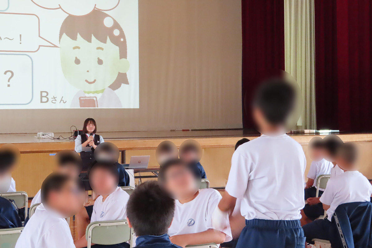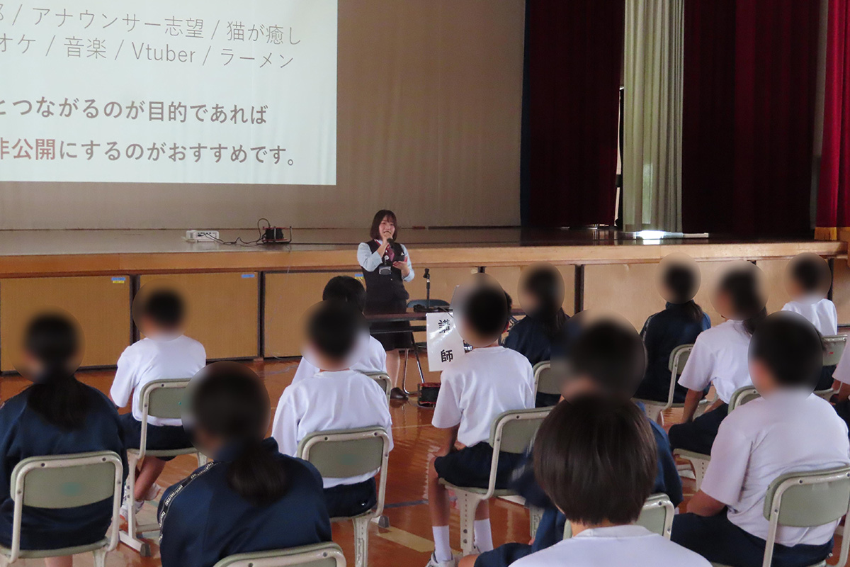 SNSとは社会的な交流の場を提供するインターネット上のサービスであることや、SNSと呼ばれる代表的な「LINE」「Twitter」「Instagram」について解説し、それぞれ使用する際に起こり得るトラブルや問題点を具体的な事例を交えながら紹介した。気をつけなければいけない注意点を始め、SNSは正しく使えば便利で楽しいものである一方で、使い方を間違えてしまうと人生を狂わせる凶器にもなることから、正しい使い方とマナーを身に付ける大切さについて学習した。