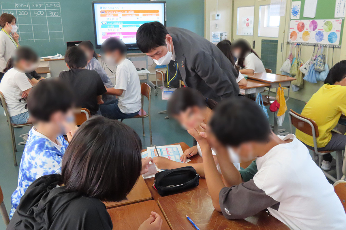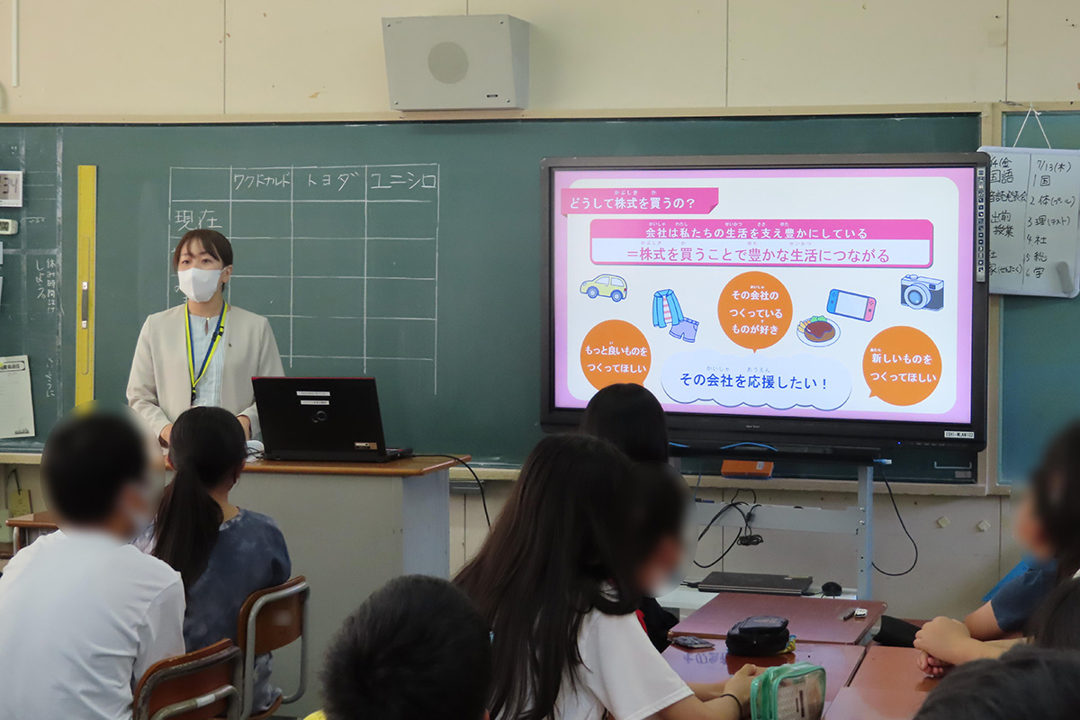 会社とは、生活に必要なモノやサービスを生み出すところであり、私たちの生活を支え、豊かにしてくれる働きがある。その「会社」と「株式」の関係について仕組みを理解し、株式を買うことで豊かな生活に繋がっていることを学んだ。「株式」の理解を深めるために「株主体験ゲーム」を実施し、会社の社長の話を聞いたうえで応援したい会社の株式を購入。投資された金額・世界の動き・会社の業績などといった株価の変動を体験しながら、世の中に役立つ会社を選ぶことはとても大切であり、投資をするための準備として、その会社を知ることや世の中をよりよくするためには何が必要なのかを考えること、周りの状況をよく知ることが大事だということを学習した。