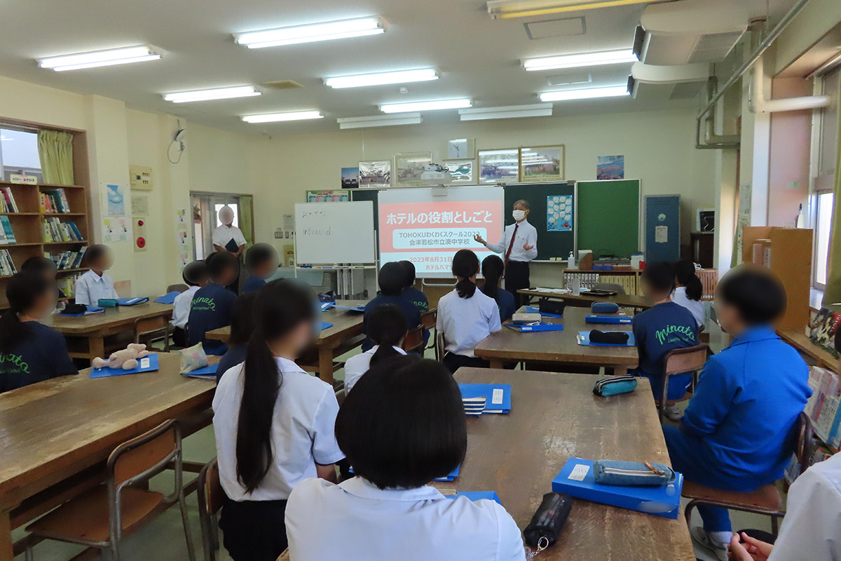 ホテルには上質な宿泊施設を提供することや、上質な食事や会議・会合パーティーの場を提供する役割があり、そのホテルの役割を遂行するための、ホテル従業員の役割や業務について理解した。福島県を訪れたい人を増やすためには福島県の個性を活かした魅力づくりや、観光を盛り上げる人材を育成することが必要であり、福島県に行ってみたいと思わせることと、気持ち良いと感じさせるサービスが大切であることを学んだ。また、自分たちの生活は様々な業種や職種に従事する方々のおかげで成り立っていることから、どのような仕事でも働くことを通して社会の役に立っていることについても学習した。