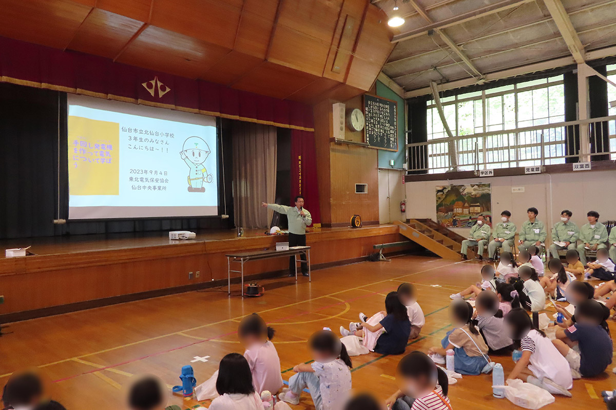 家の中で電気を使うものには何があるか、それらを使用する際の電気の正しい使い方について学んだ。また、私たちの生活に電気がなくなるとどのように不便になるか、電気は発電所から送電線や変電所を通して運ばれていること、発電所の種類や仕組み、発電に必要なものなどについても学習した。電気が作られる仕組みを学んだ後には手回し発電機を組み立て、LEDの点灯やオルゴールを鳴らす体験授業を行った。