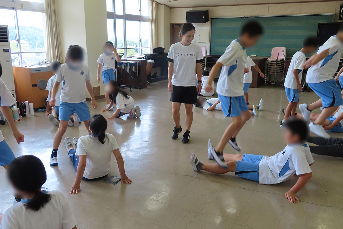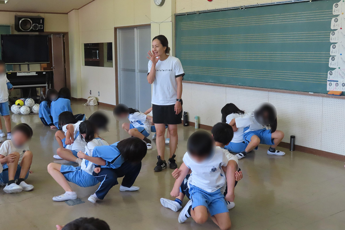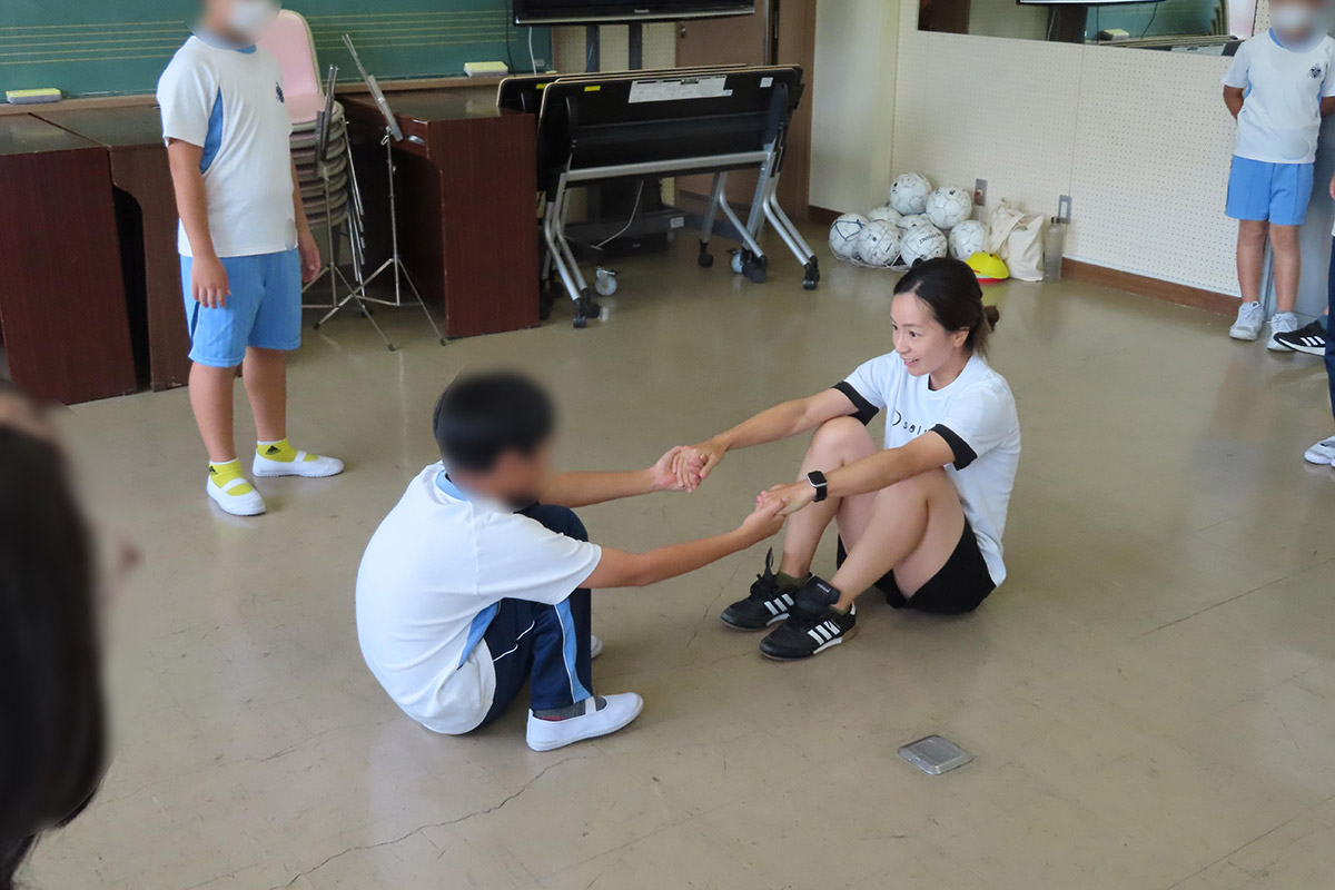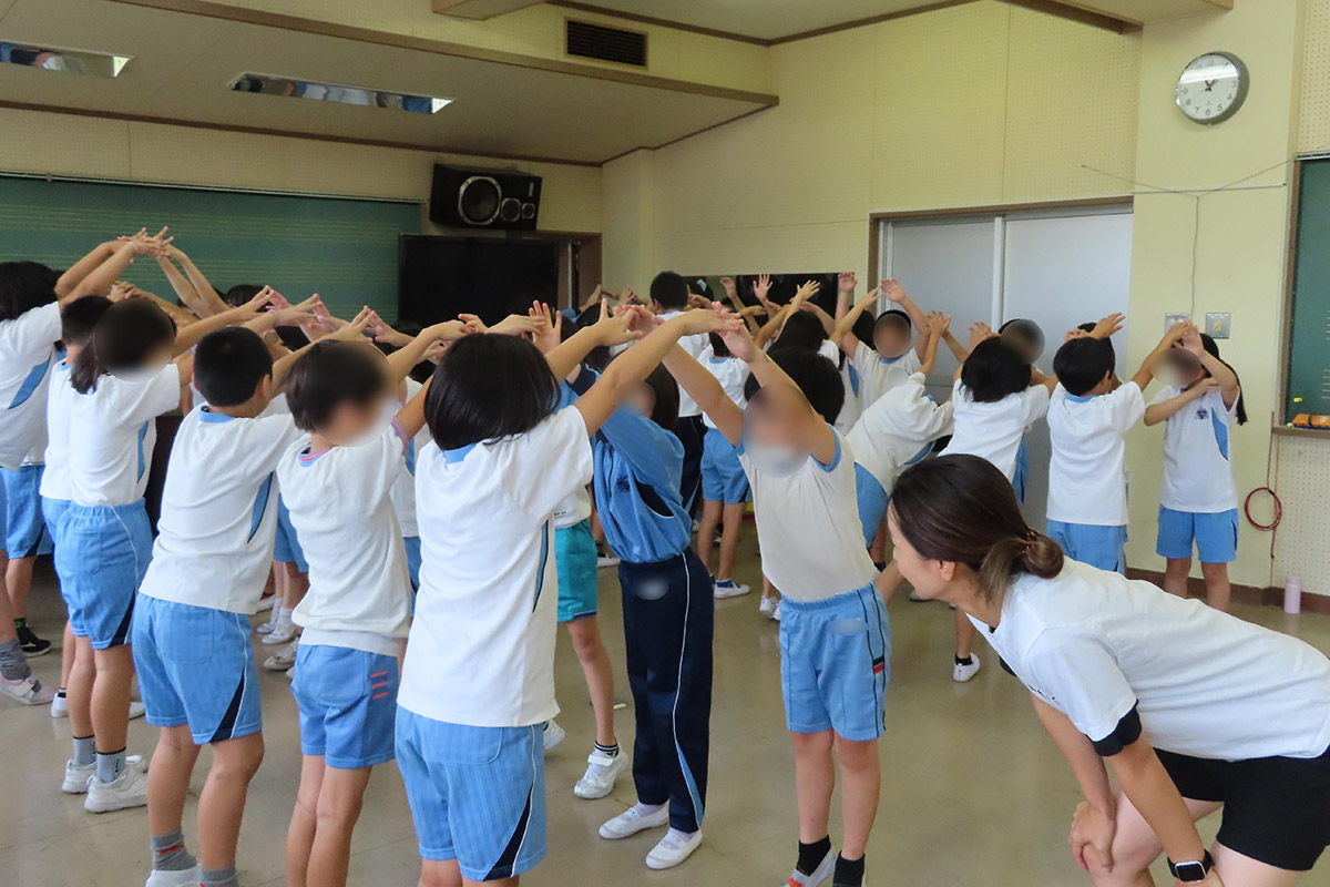 熱中症対策のため、クーラーが効いた教室の中で学年ごとに分かれて実施。合図に合わせて隣の人とジャンケンをしたりその場にうつぶせになったりする動きや、2人1組で向かい合わせや背中合わせになって同時に立ち上がる動きなどを行った。後半はボールを使用してチーム戦を実施し、室内でもできる様々な動きを取り入れながらチームで協力し合う楽しさや大切さを学習した。また、自分の将来のために日頃から運動する習慣を身につけることの重要性についても学習した。