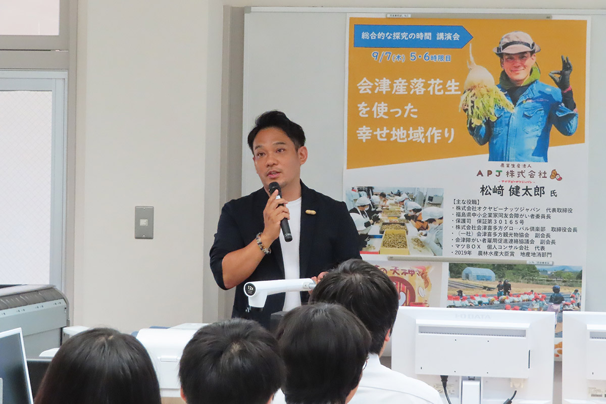 講師自身のこれまでの経験を紹介し、「人を幸せにするならまず自分が幸せになること」を基本とした経営理念(豆商いの3つの心)について解説した。東日本大震災や新型コロナウィルスの感染拡大をきっかけに理念を見直し農業法人にしたことや、そもそもピーナッツは会津地方の産地であったことなどから地域資源の再生のためにピーナッツ作りを始めたことを話された。6次化と農商工連携型6次化の違いを理解し、地域にある資源と資源を組み合わせてコラボレーションすることで新たな資源を生み出されることから、地域資源を考えることの大切さについて学んだ。
