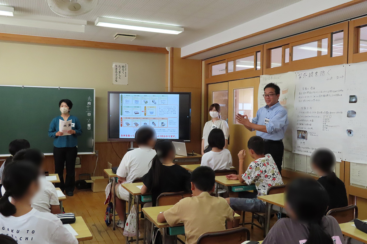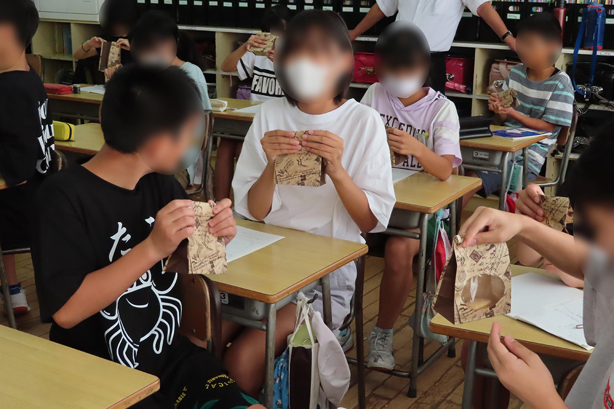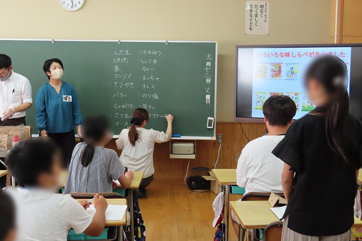 おせんべいの原料や、おせんべいとあられ・おかきの違い、おせんべいの歴史や種類などについてクイズ形式で学んだ。おせんべいは「うるち米」、あられやおかきは「もち米」を原料としていることから、それぞれの工程の違いや、実際に焼く前のおせんべい(せんべい型にして乾燥させたもの)に触れ、形や硬さの違いを確かめた。当社の商品である「味しらべ」に、チーズ味を含めた2種類のフレーバーを使用して味付け体験を実施。焼きあがったおせんべいに、それぞれのフレーバーを好みの味加減にして試食した。新商品(味付け)のアイデア出しでは様々な種類の味を考え発表した。
