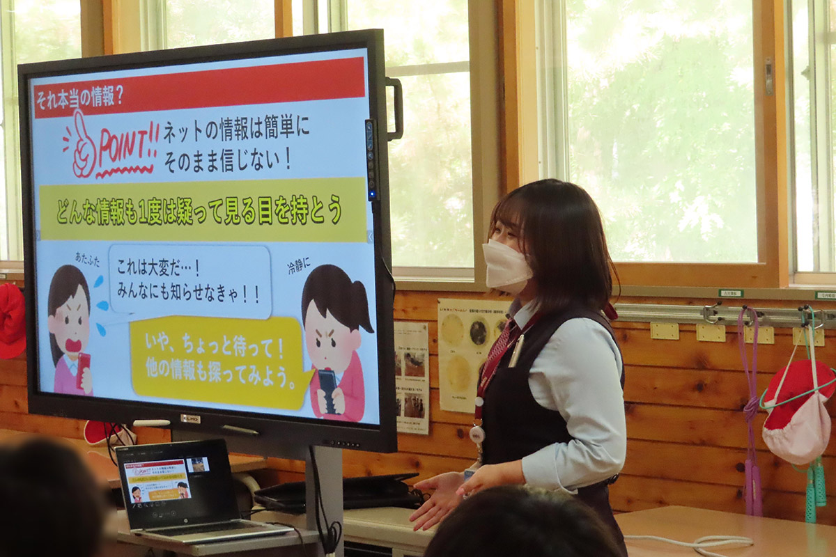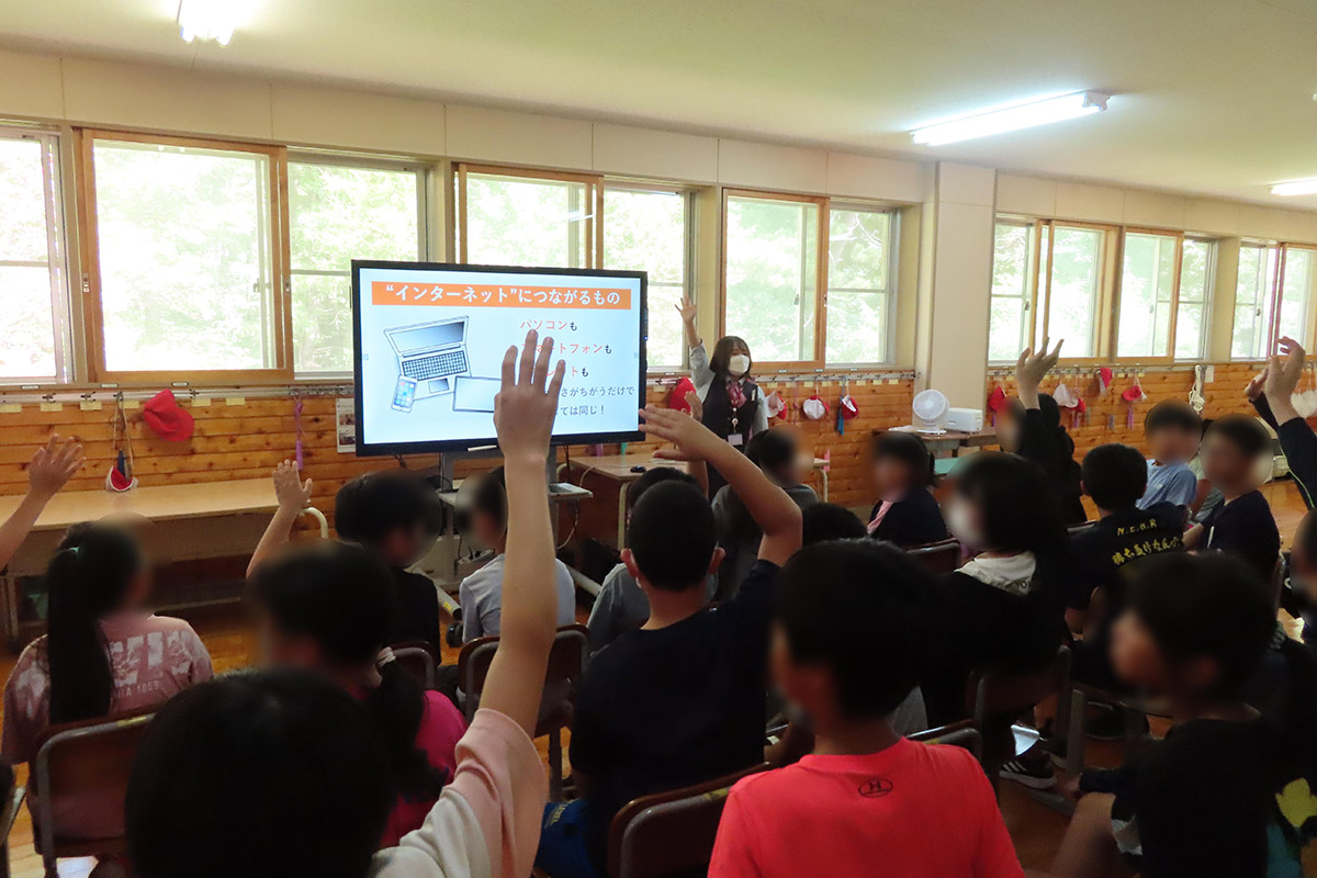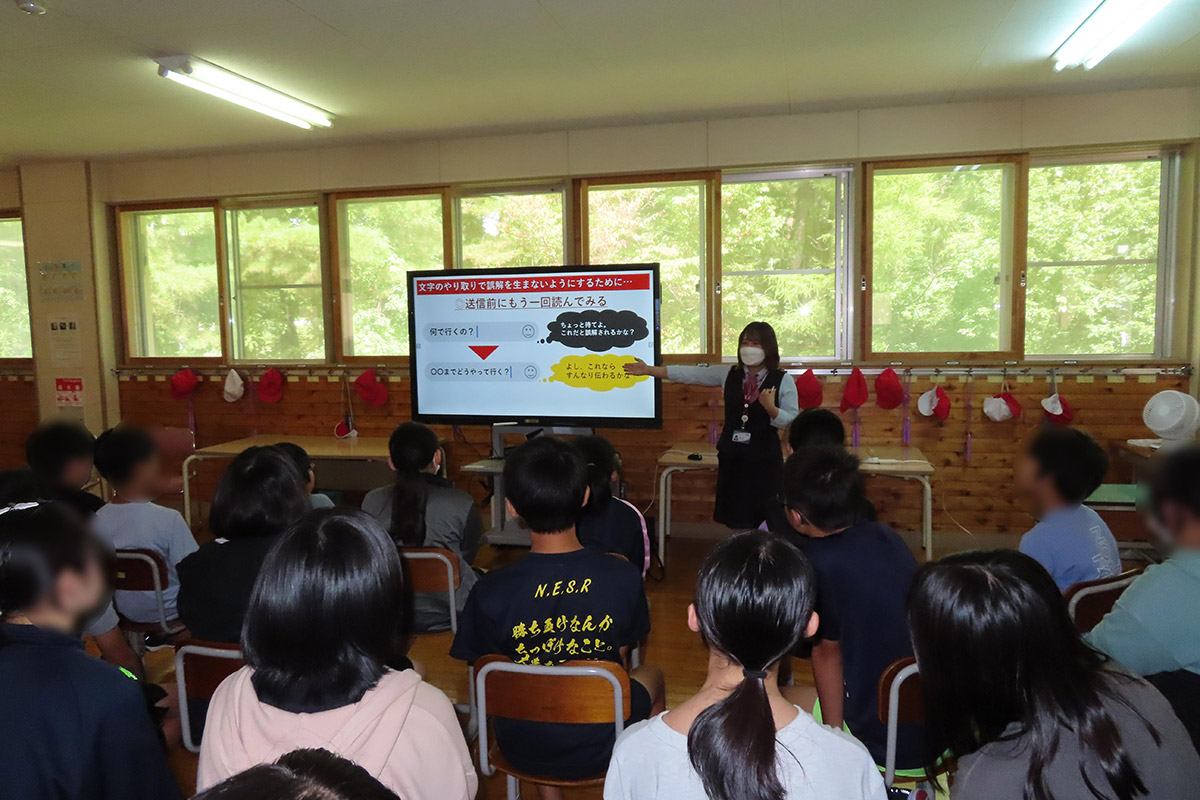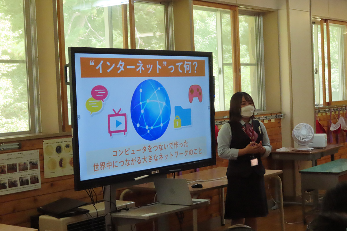 インターネットとは「動画を観る」「メッセージのやり取りをする」「ゲームをする」など、コンピューターを繋いで世界中に繋がるネットワークのことで、それぞれに起こり得るトラブルや問題点を実際に起きた事例をもとに紹介した。トラブルや犯罪に巻き込まれないためにそれぞれの場面で気をつけることや注意する点、対応の仕方や考え方など、正しく使う力を身につけるための具体的な対応の仕方を学習した。インターネットは正しく使えば便利で楽しいものである一方で、使い方を間違えてしまうと人生を狂わせる凶器にもなることから、正しい使い方とネットリテラシーを身に付ける大切さについて理解した。