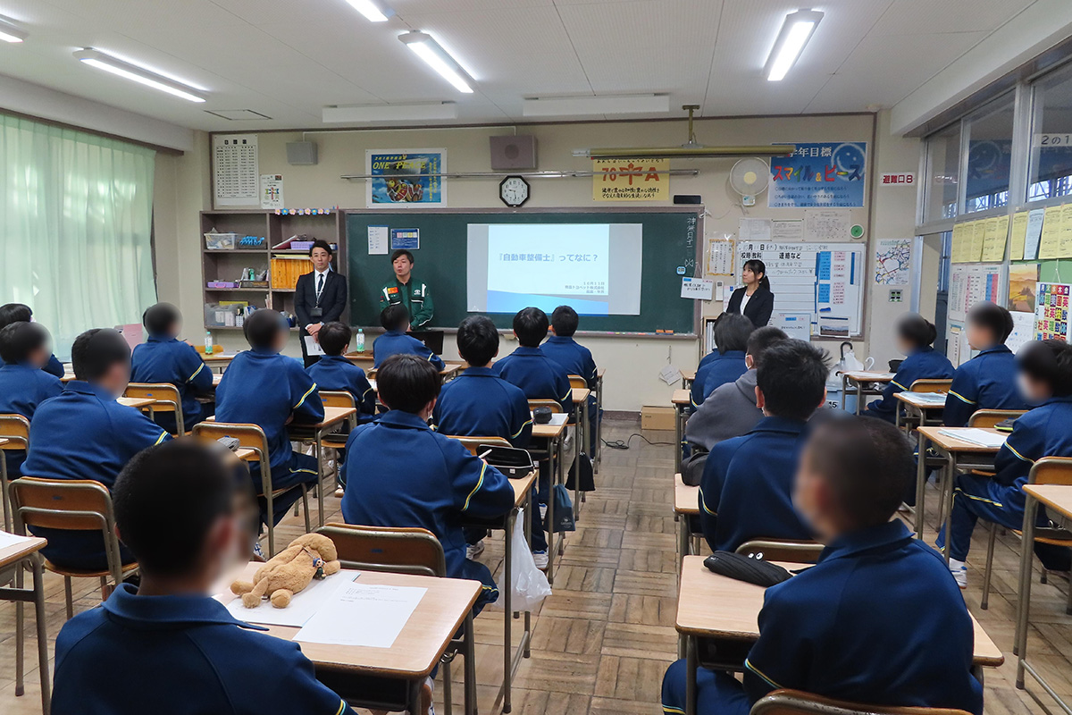 アイスブレイクでは、なぜ仕事をしているのかと問われた際の3通りの回答をもとに、どの回答者はどのような思いで仕事に向き合っているのかをグループ毎に話し合い、仕事の向き合い方で、どんな人と一緒に仕事をしたいと思うのかを考えた。前半の講義では、整備士には「車のお医者さん(カードクター)」と「お客様のカーライフアドバイザー」の2つの役割があることや、具体的な仕事内容、CS(お客様満足度)について詳しく学んだ。後半は、実際に整備に使用するパソコンを使用して自動車機器を操作したり、スマートフォンで遠隔操作をして車を前後に動かしたり、最新の技術体験を行ったほか、自社で取り組んでいるコミュニケーションツールを使用したゲームも行った。