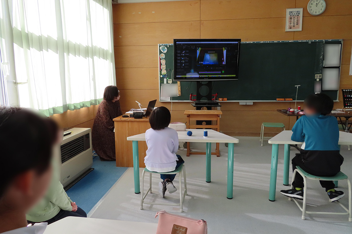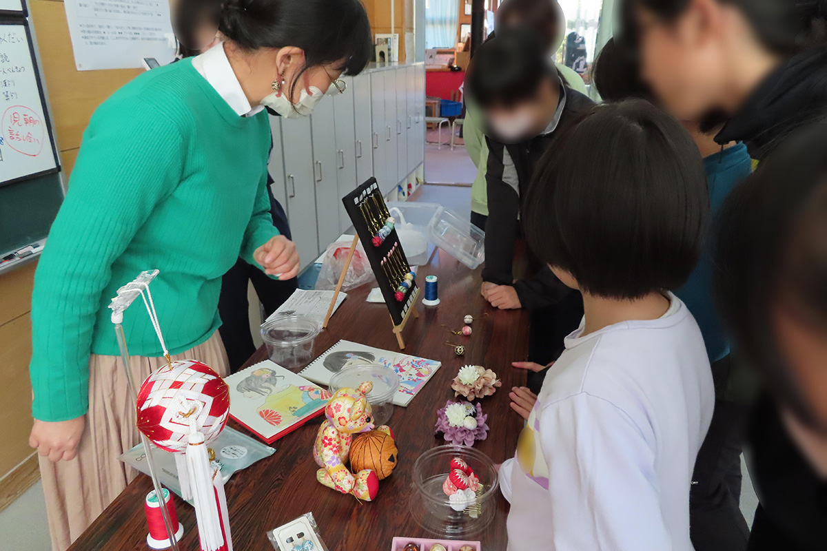 前半は学校の良いところを伝えるミニミニ動画の作成を行った。事前に学校内で好きな場所を写真で撮影し、撮った場所の良さを「言葉」にして話してもらうため、カメラマン・音声・ディレクターの役割に分かれてカメラで撮影を行ったあとに、時間内で出来上がった「4~6年生が作った 岩泉町立有芸小学校の好きなところ動画」を鑑賞した。後半は「本荘ごてんまり」の歴史や時代背景について学んだ。ごてんまりの中でも土台となる「かけまり」の技術を理解し、実際にかけまりの作成体験を行った。ごてんまりを使って作った様々なアクセサリーにも触れて理解を深めた。