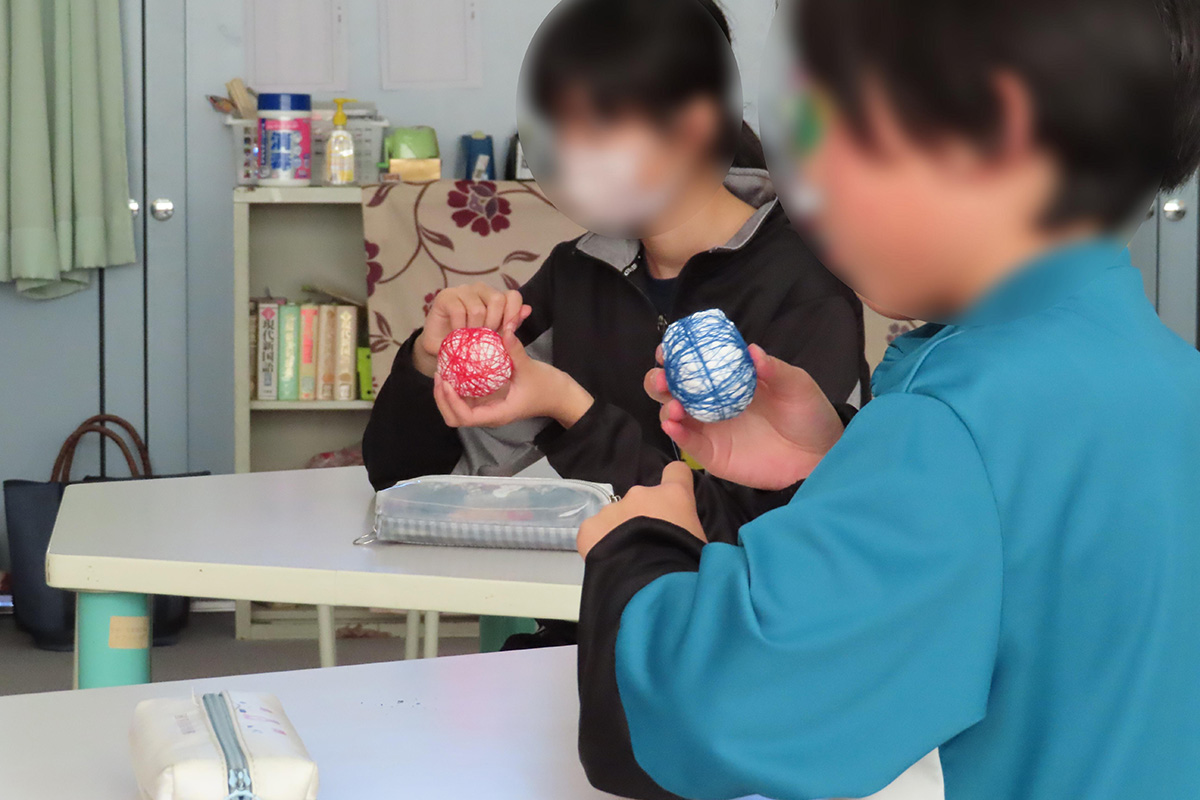 - かけまりの体験をしてみて、丸くするのが大変だったり、糸で白い場所を埋めるのが大変でした。実際に作品なども見れてうれしかったです。