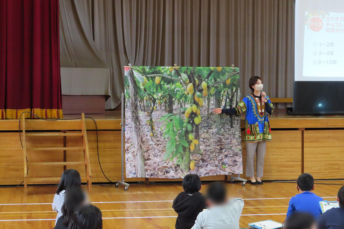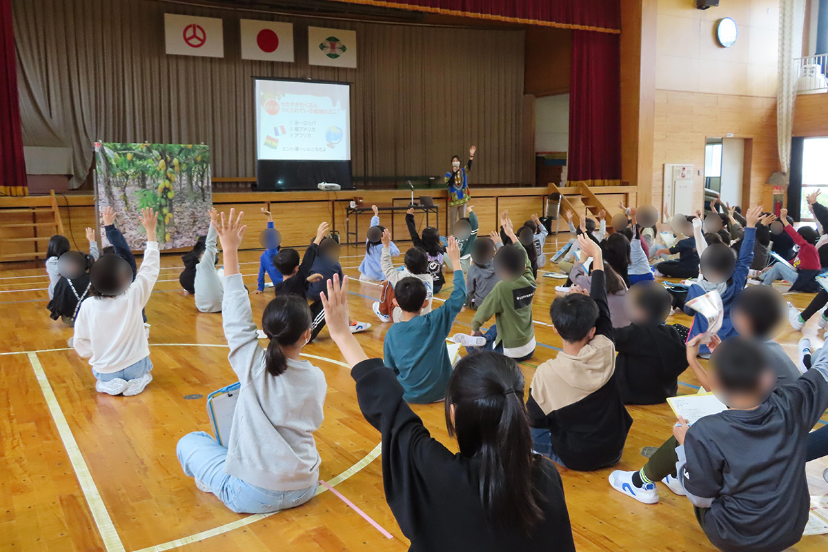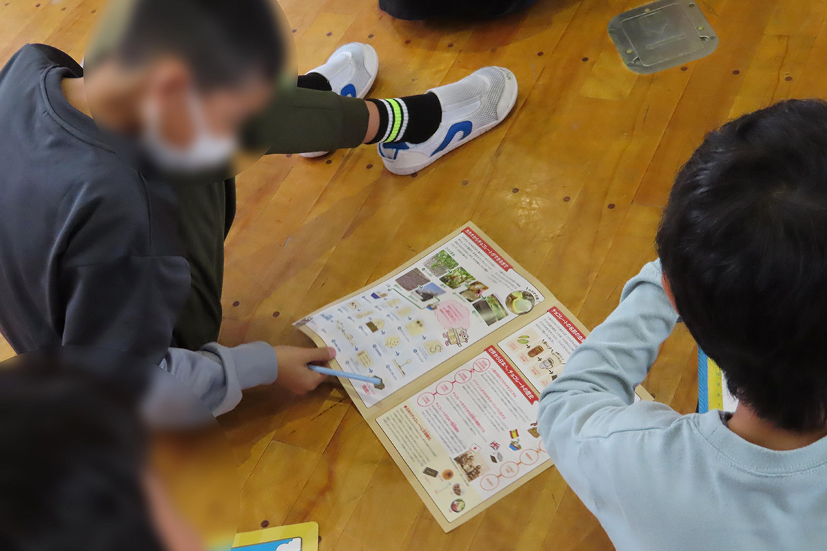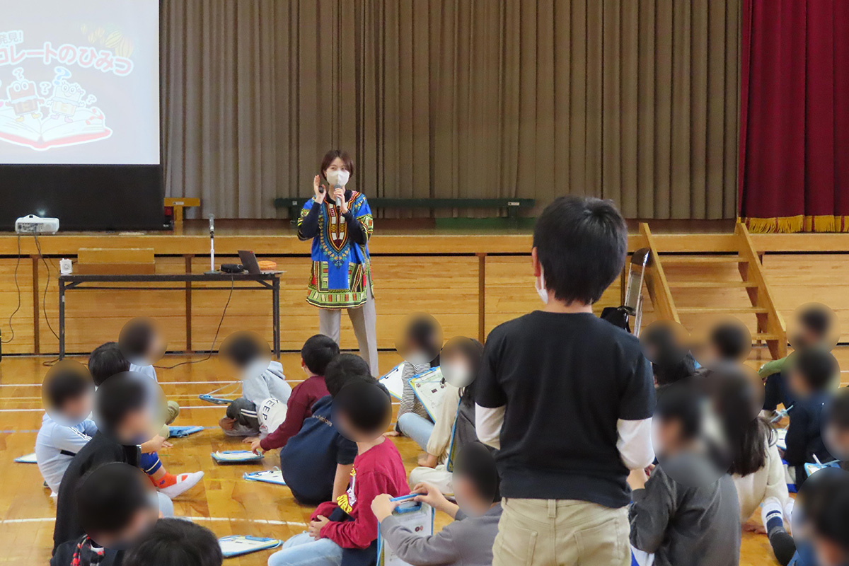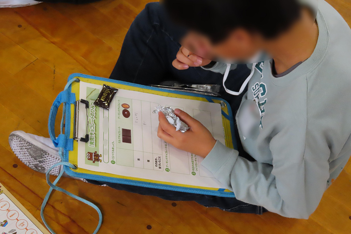 チョコレートの原料であるカカオの原産地・実・花のほか、カカオが原産国から日本に出荷されるまでの工程についても、クイズや動画を交えて理解した。チョコレートが出来上がるまでの工場の様子を動画で視聴し、「おいしい」「食べやすい」「きれいに同じ形をつくる」「たくさんつくる」工夫と、アーモンドチョコレートが出来上がる仕組みについても学習した。ミルクチョコレートとアーモンドチョコレートの食べ比べ体験を行い、それぞれの形や味、そのほか気付いたことなどをワークシートに記入した。