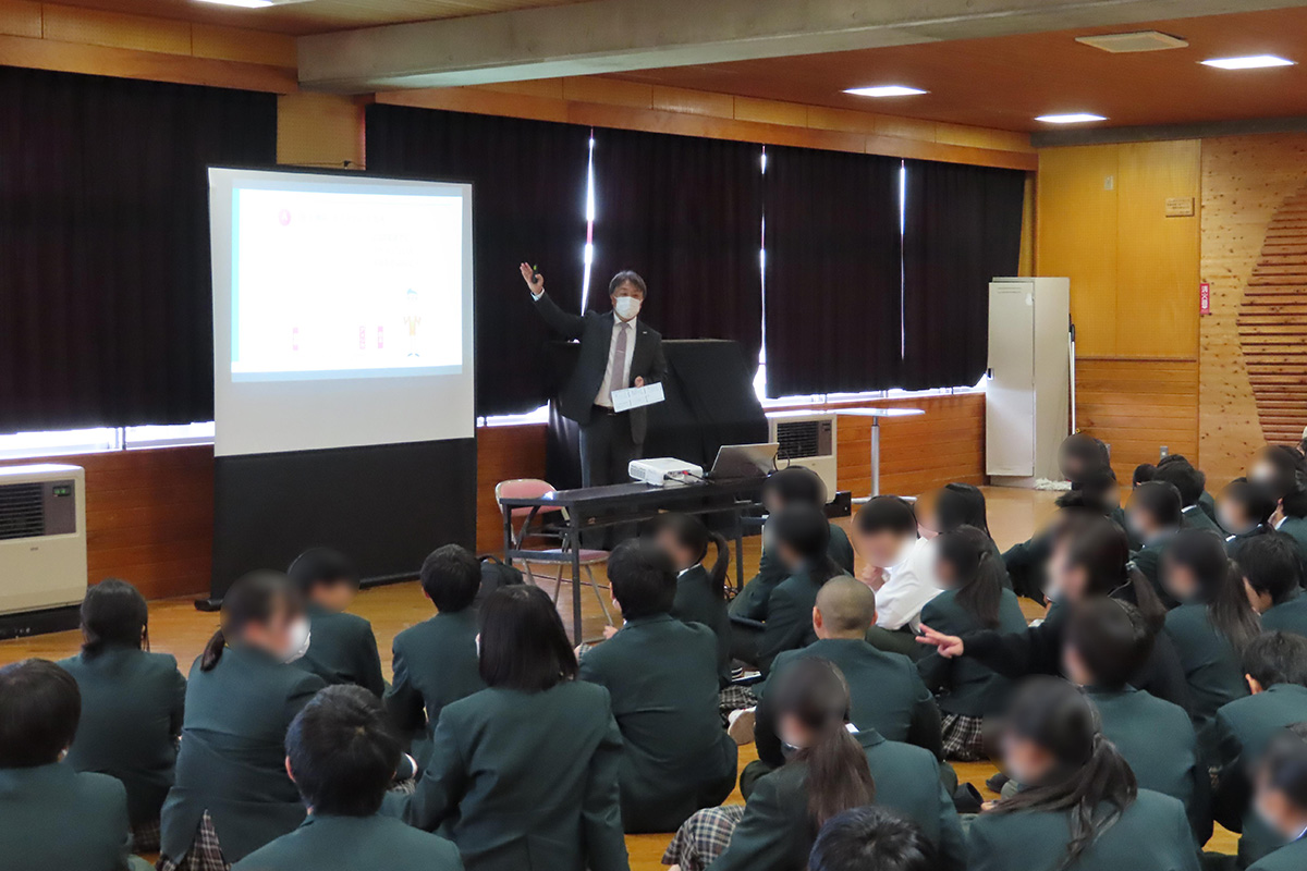 前半は、クイズ形式で分かりやすく中高生のキャッシュレス事情やキャッシュレス決済の分類について、支払いの方法と手段によって分類されることを説明された。また、主な金融トラブルの「名義貸し」、「アルバイト詐欺」を紹介するとともに、被害に遭わないために、その手口を知っておくことが重要であり、日頃から消費者トラブルに関心を持っておくことが大切であることを話された。後半は、ライフプランを考えた資金計画と資産運用の必要性を説明するとともに、投資体験ゲームと通して株式投資の仕組みを学んだ。