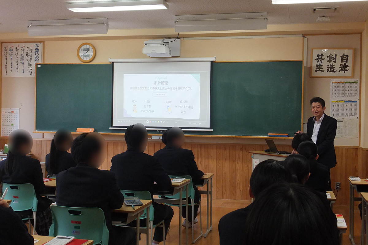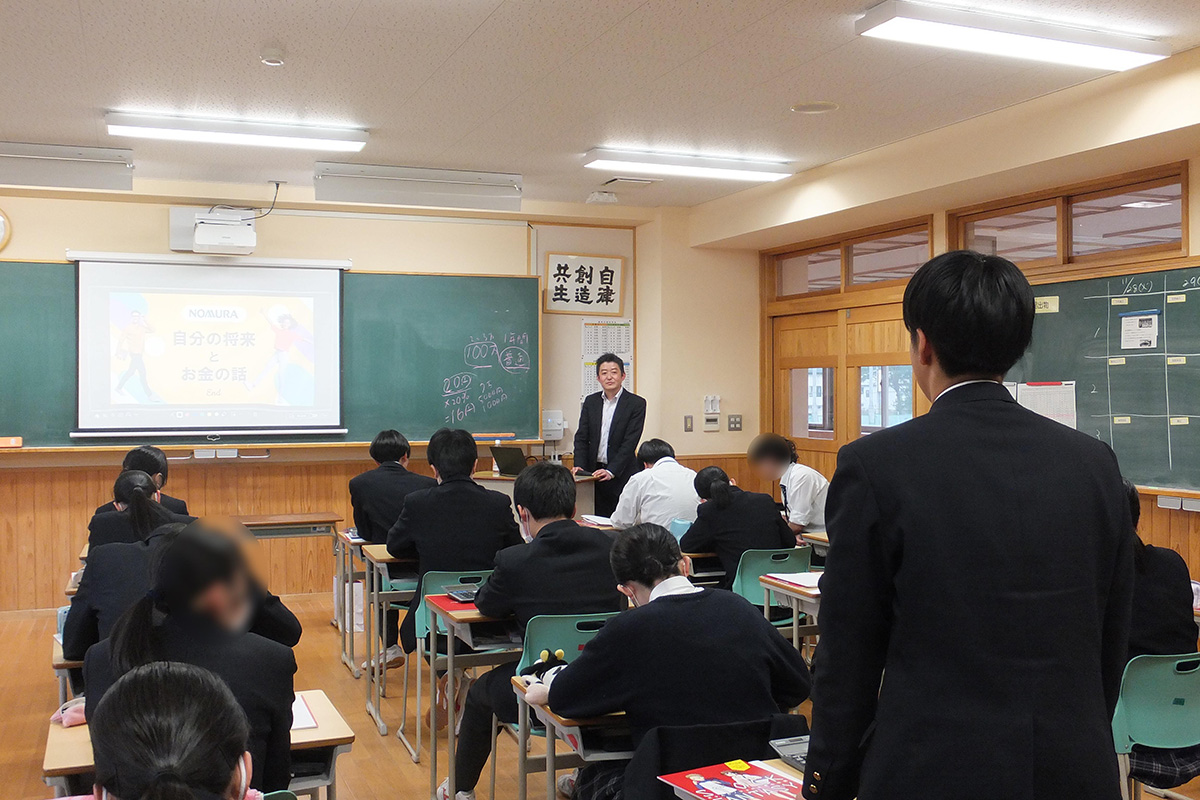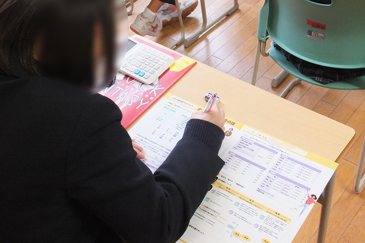 自分の将来の夢を実現するためには金融リテラシーを高める必要があることを理解し、自分の将来とお金についてワークシートを用いて考えた。まずは家計のイメージを掴むために、家計管理において重要なことについて学び、自分の目標のためにはお金がいくら必要で、毎月の収入の内いくら貯蓄をすれば目標に達するのかを考えた。つぎに、就職したあとの20年間のライフコース(1人暮らし・結婚・子ども・住居など)を完成させ、考えたライフコースに必要なお金を計算した。将来に向けてお金を準備するための資産形成には「預金」「株式」「債券」の3つの方法があり、それぞれのメリット・デメリットを学ぶとともに、投資は「分散」「積立」「長期」の3つの視点が大切なことを学習した。