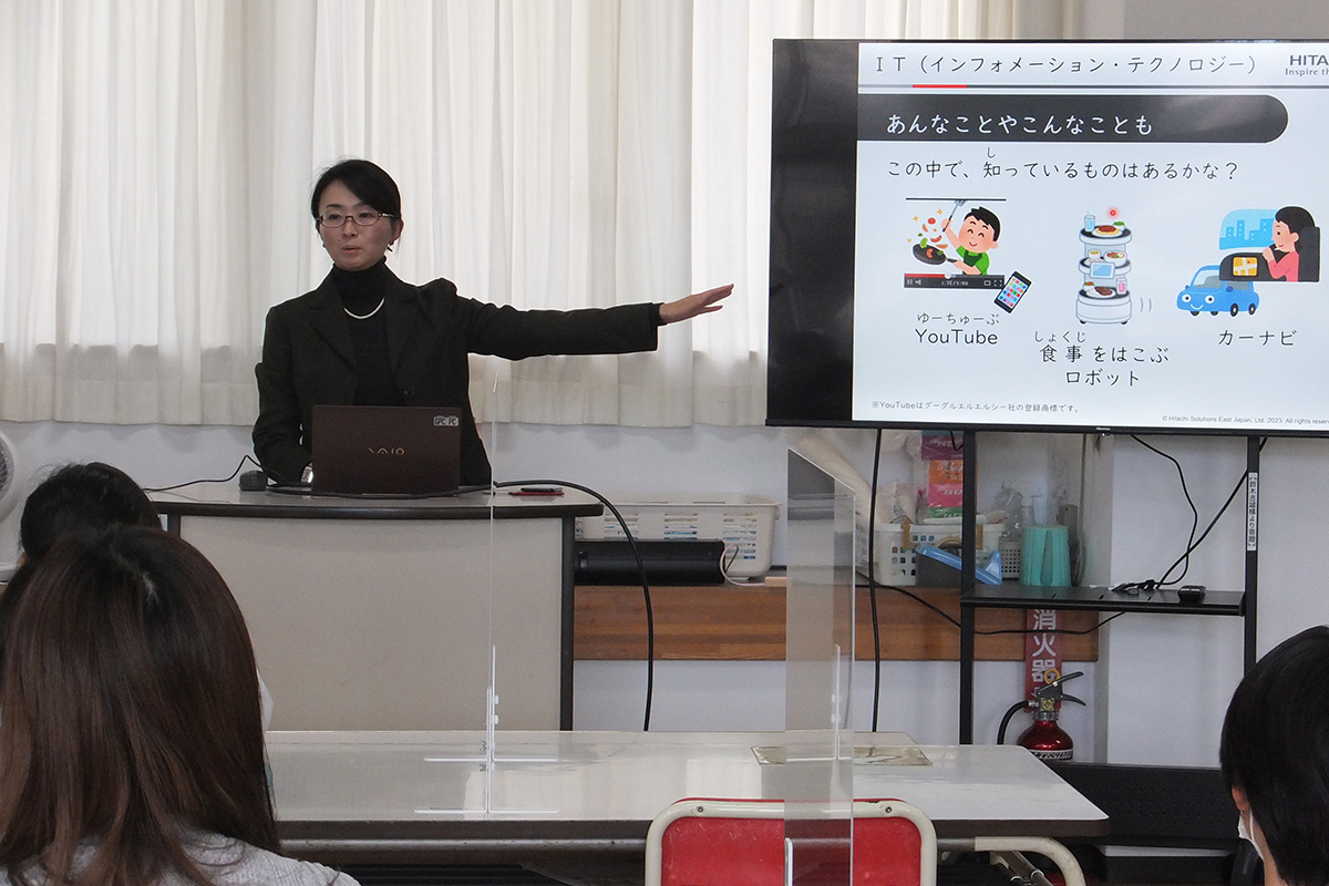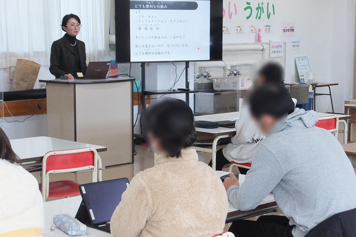 日常生活の様々なところで使われているIT(インフォメーション・テクノロジー)について、ITがなかった時代といまを比較しながら、その仕組みや私たちの生活になくてはならない身近で便利な技術であることを学んだ。また、SNSを使う際に、気をつけることを説明し、使う前に大人の人に相談することの大切さを理解した。最後に、未来のことを予想して、何ができたらすごいか。どんなことをやりたいかを考えて、発表した。