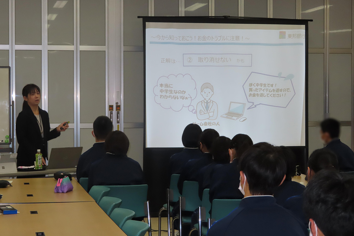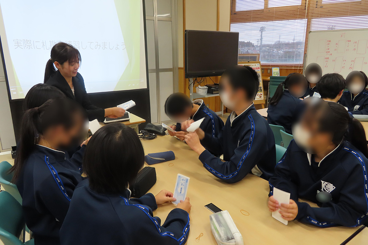 お金の流れや金融、「預金」「融資」「為替」の三大業務などについて学ぶとともに、これからのライフイベントにかかるお金はどのくらいなのかを知り、どのように準備をしていけば良いのかを学習した。銀行でのSDGsの取り組みや、金融に関する知識の向上を通じて、将来、経済的に自立し、より良い暮らしを送ることを可能にすることを目的とした金融教育についても紹介。また、実際に起こった金融トラブルの具体例を通して、トラブルにあってしまった時の対処法についても学んだ。最後に模擬紙幣を用いて「札勘(お金の数え方)体験」を行った。