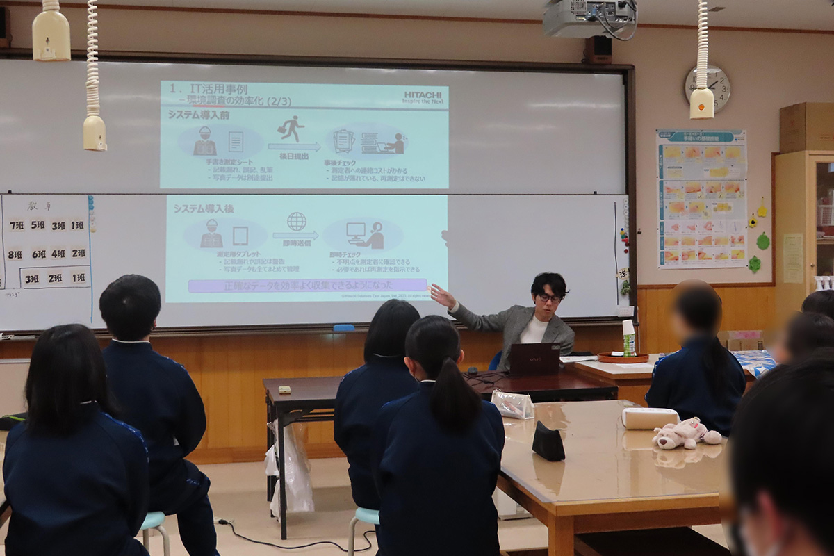 ITの活用事例「環境調査の効率化」について、放射線の空間線量率測定結果を、ITを活用して効率よくデータ収集・集計して地図に表示するために、システムを導入する前後や、調査支援システムなどの仕組みについて解説した。また、システムエンジニアの仕事とは、パソコンを使ってプログラムを作成する仕事ではあるが、チームで作り上げる仕事なのでコミュニケーション能力が必要となってくることや、コンピュータの専門知識の他にもお客様のビジネスや業務内容などにも精通する必要があることを学んだ。また、システム開発の流れについて、システムを作り上げるまでの工程を学習した。社員の1日の仕事の様子や大変だった仕事、やりがいについても話をうかがった。