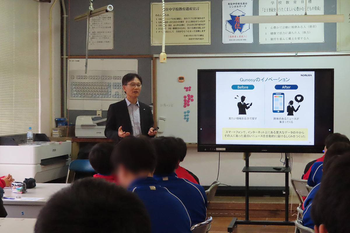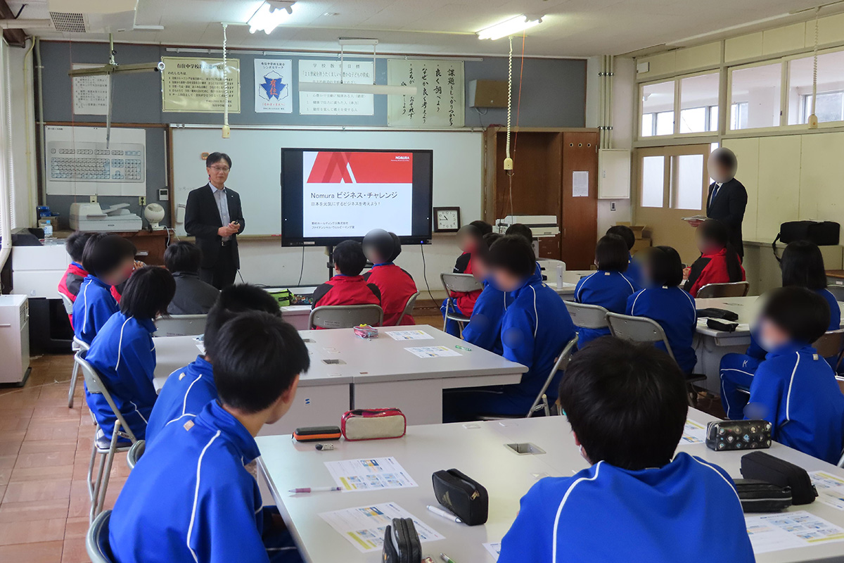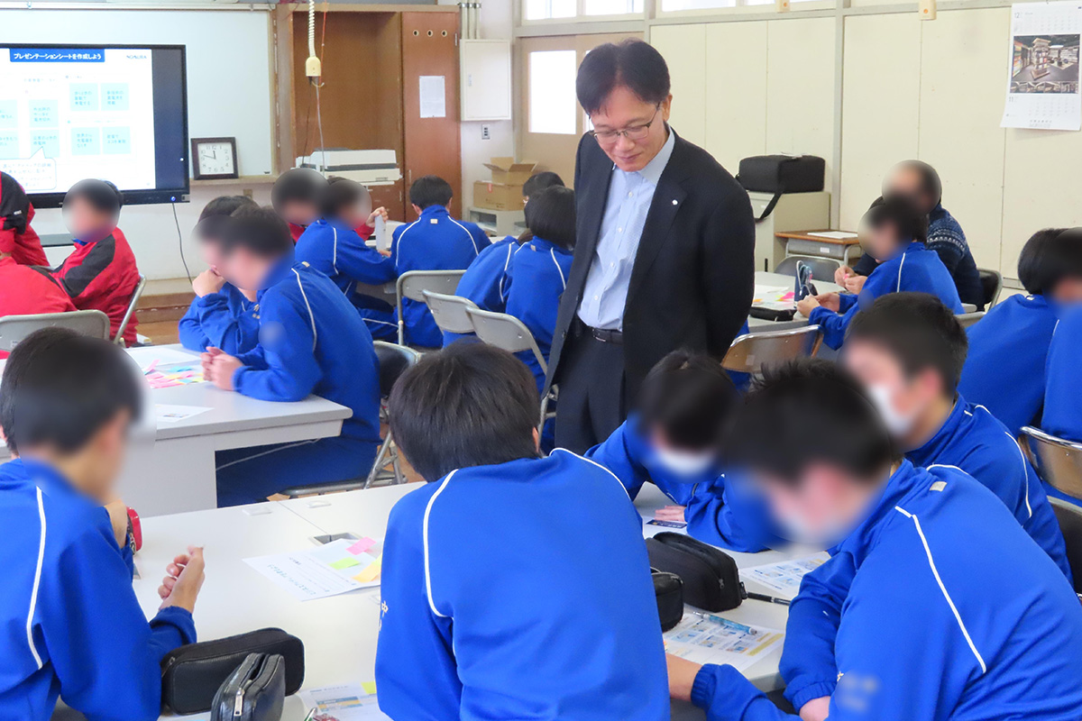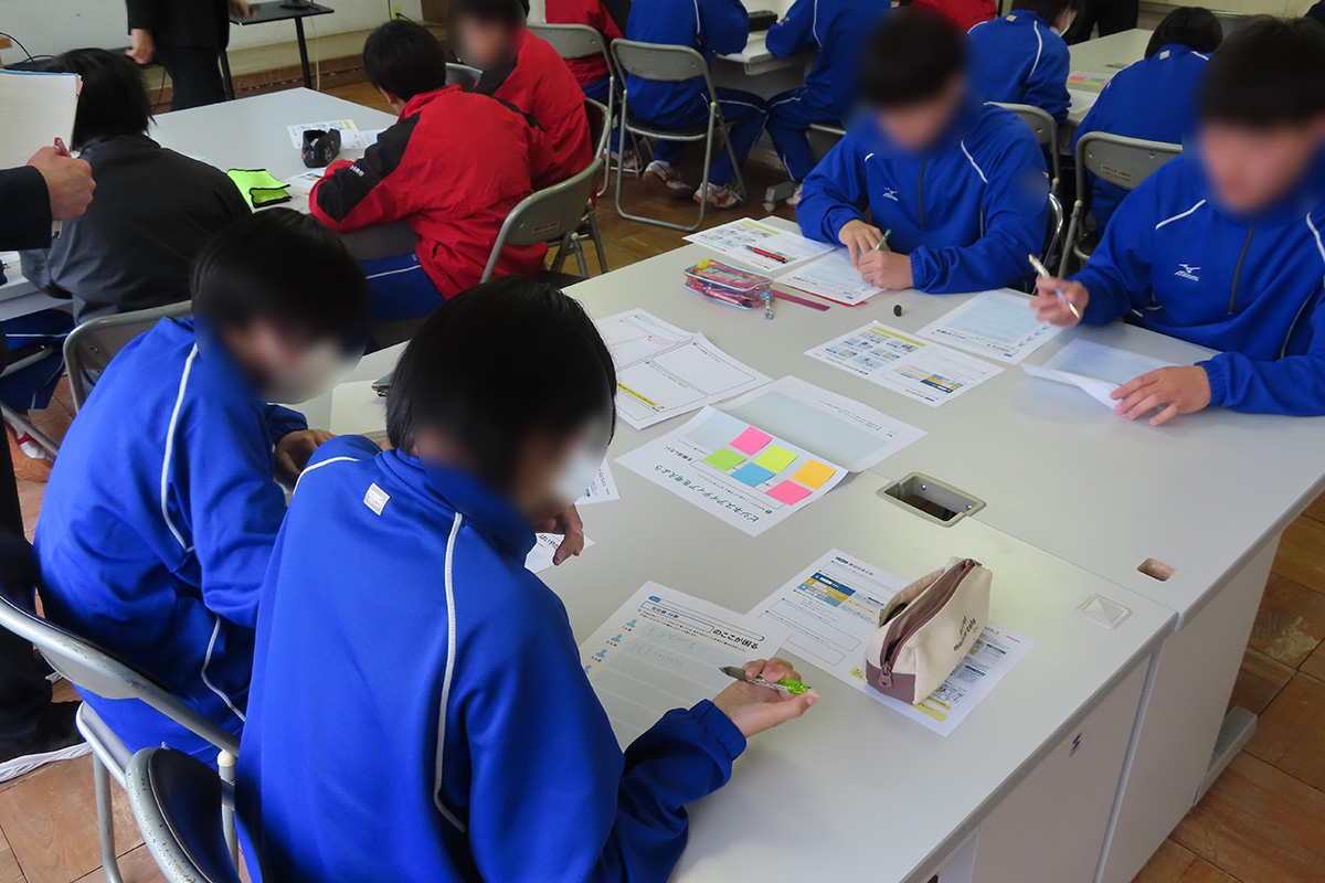 イノベーションが生まれる仕組みについてイノベーションが社会に大きな変化をもたらしてきた事例を交えて学ぶとともに、起業家のインタビュー映像を見て企業・イノベーションについて考えた。グループに分かれ「住んでいる町の冬・雪」「買い物」「給食・弁当」「青春」「文房具」「学校行事」などの身の回りにある「ここが困る」という問題点をテーマ毎に1人ずつ書き出し、最も解決したい問題点をグループで1つ選び、それを解決するためのビジネスアイデアを考えた。グループで考えたアイデアをより具体化し、プレゼンテーションシートにまとめて発表し、最後に自分のグループ以外で賛同したアイデアへの投票を行った。