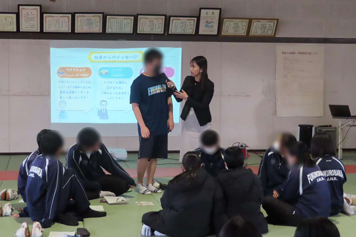 会社とは、生活に必要なモノやサービスを生み出すところであり、私たちの生活を支え、豊かにしてくれる働きがある。その「会社」と「株式」の関係について仕組みを理解し、株式を買うことで豊かな生活に繋がっていることを理解した。「株式」について、より理解を深めるために「株主体験ゲーム」をグループ毎に実施し、会社の社長の話を聞いて、応援したい会社の株式を購入。投資された金額・世界の動き・会社の業績などといった株価の変動も体験しながら、世の中に役立つ会社を選ぶことはとても大切であることを学んだ。また、投資をするための準備として、その会社を知ることや世の中をよりよくするためには何が必要なのかを考えること、周りの状況をよく知ることが大事だということのほか、投資詐欺についても学習した。このほか、銀行の役割や地域社会との繋がり、地域貢献活動に取り組む目的についても話された。