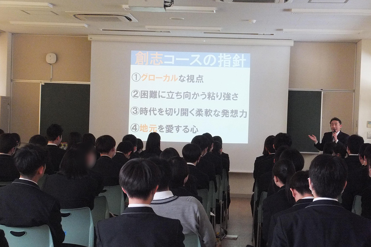 イノベーションとは何かについて考え、何が起きても生きていけるよう新しい知識を獲得すること、そのために物事に本気で取り組むことの重要性を伝えた。そして、無限の可能性を見据えて「捨てる」「つなぐ」「忘るな」を基本とし、今後の人生の可能性を拡げるために勇気をもって試みる大切さについて学んだ。また、物事を自分軸と他人軸、そして、時間軸に置き換えて第3の道を考える視点についても話された。