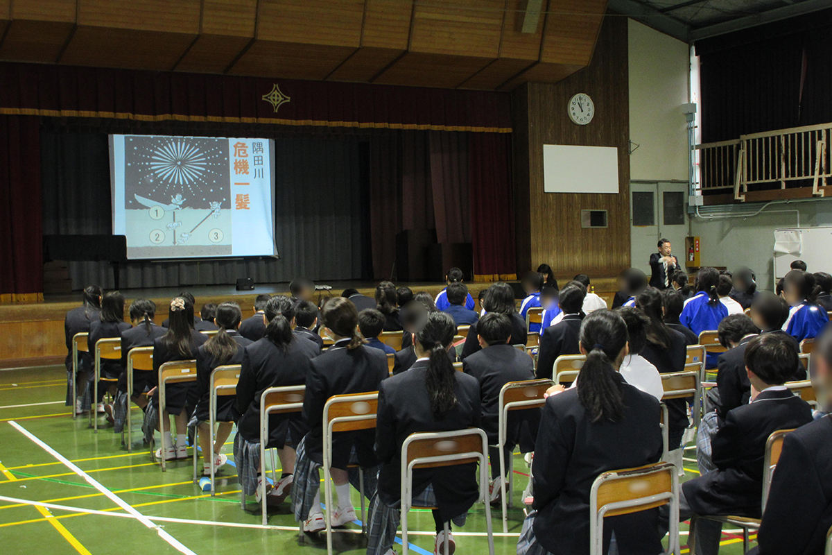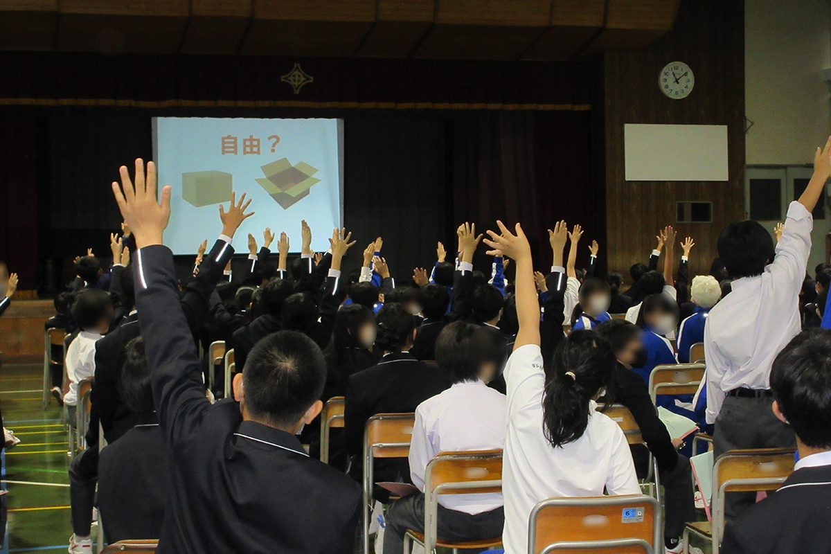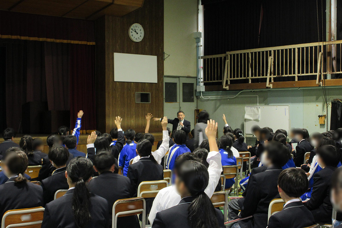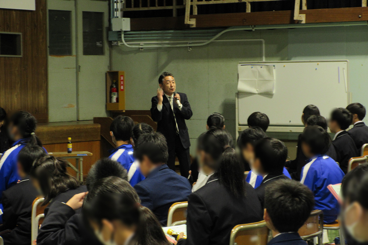 文化のちがいや立場のちがいでモノの見方・価値が変わること、他者を理解することで視野・考え方が拡がることを学んだ。世の中には、変わるものと変わらないものがあり、目的・本質を忘れないでゴールを考えてスタートすることの大切さについても学んだ。また、中学生が成長するために、①人から学ぶ、②本から学ぶ、③旅(現地を確認する・体験する)から学んで、本気になって取り組めることを見つけてほしいと話され、みなさんには無限の可能性がある。マイゴールに向かって、行動する、経験することの重要性を伝えた。