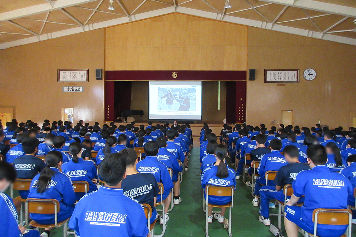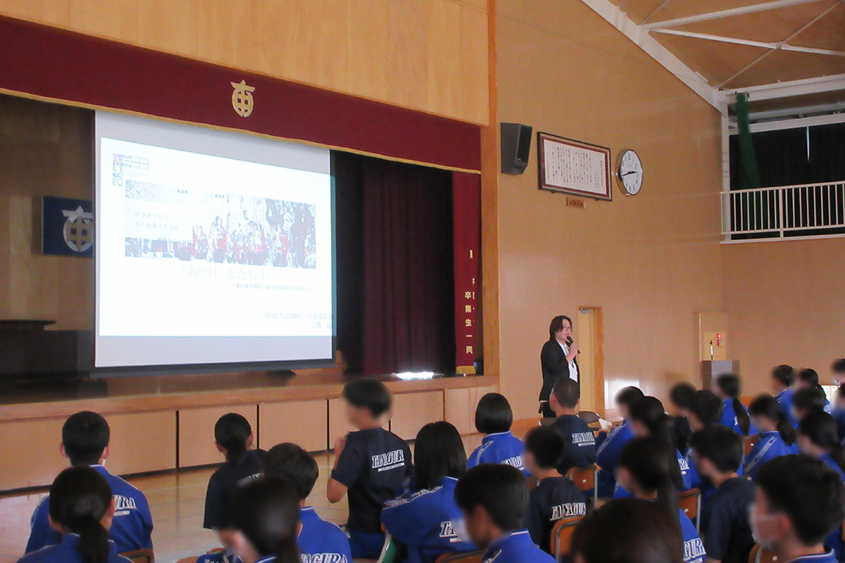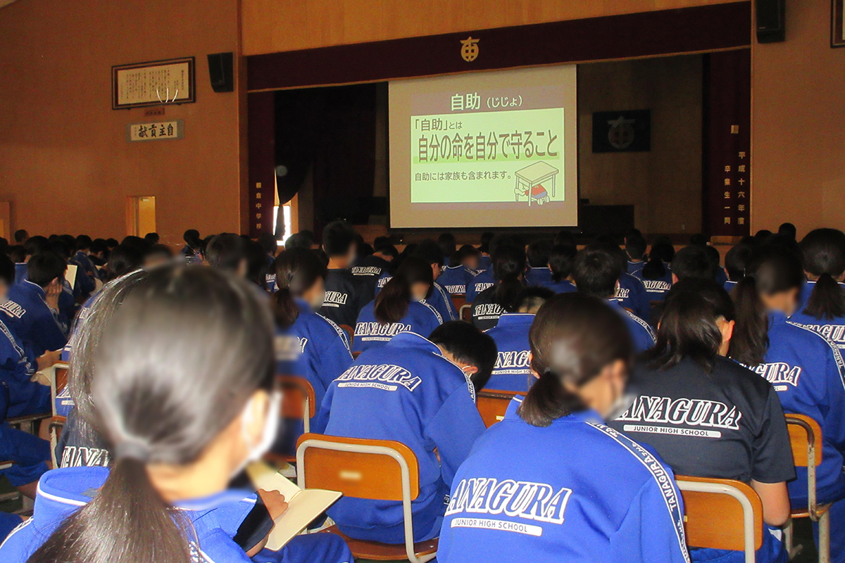 東日本大震災とはどのような地震だったのかを、被災した街や津波の様子、避難所生活の様子を映した画像などを通して理解した。今後もどのような災害が起こりうるか分からない中で、「自助」(自分や家族の命を守ること)、「共助」(近所の人や周囲の人たちと助け合うこと)、「公助」(国や自治体、消防や警察、自衛隊といった公的機関による救助・援助)に必要な日頃の備えや災害発生時の行動について学習した。また、東日本大震災を経験した語り部(震災当時小学6年生)より、震災当時の体験や、震災で変化した現在の街の様子などについて話を伺った。