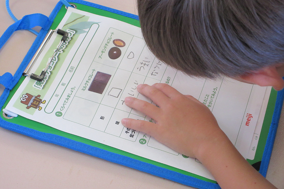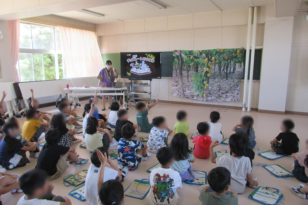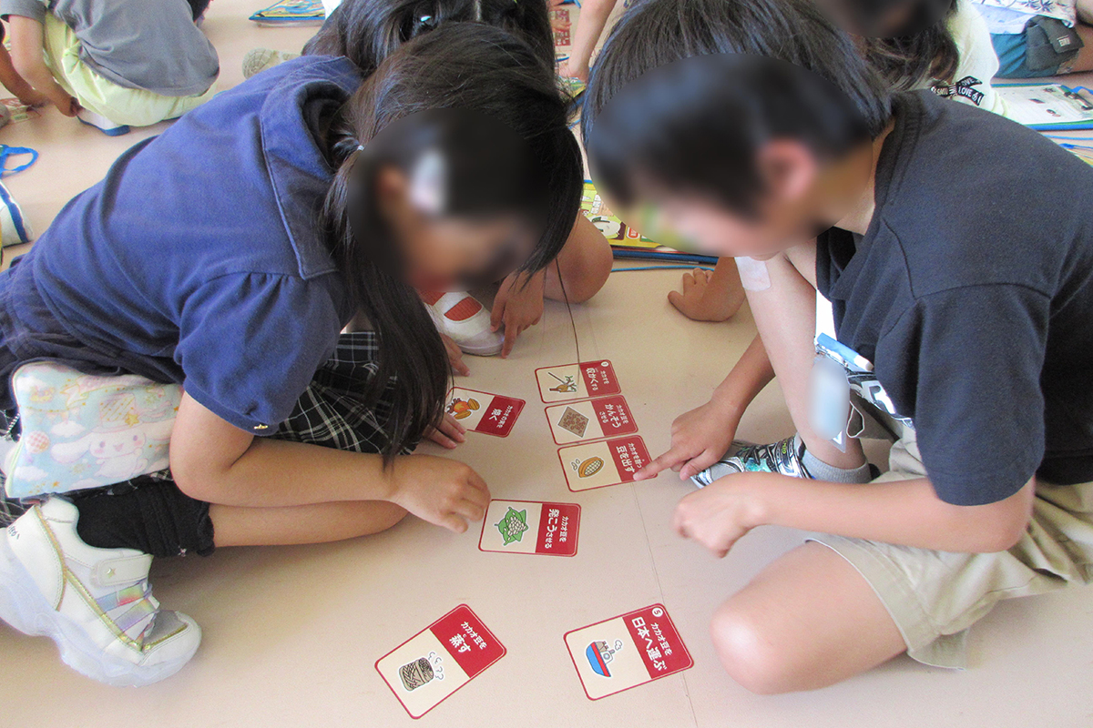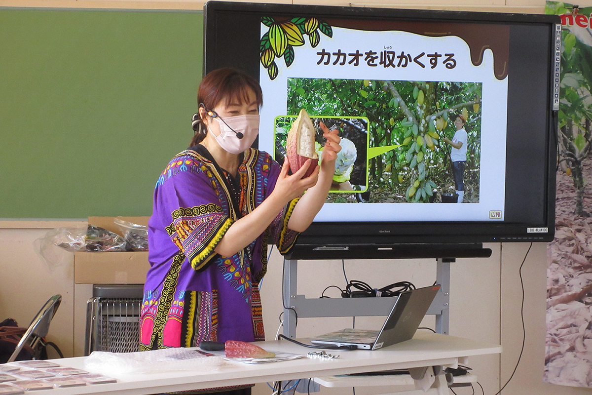 チョコレートの原料であるカカオについて、原産地や繁殖方法などの説明を受けた。また、カカオが原産地から日本に出荷されるまでの工程について、クイズや動画を通して理解した。カカオがチョコレートになるまでの過程についても、カードゲーム形式で自ら考えながら学んだ。最後にミルクチョコレートとアーモンドチョコレートの食べ比べワークを行い、味や形の違いから原材料を考えるなど、気付きをワークシートに記入した。
