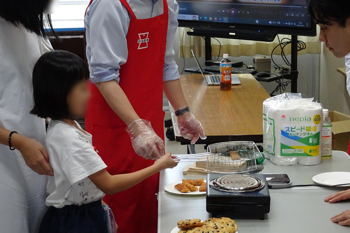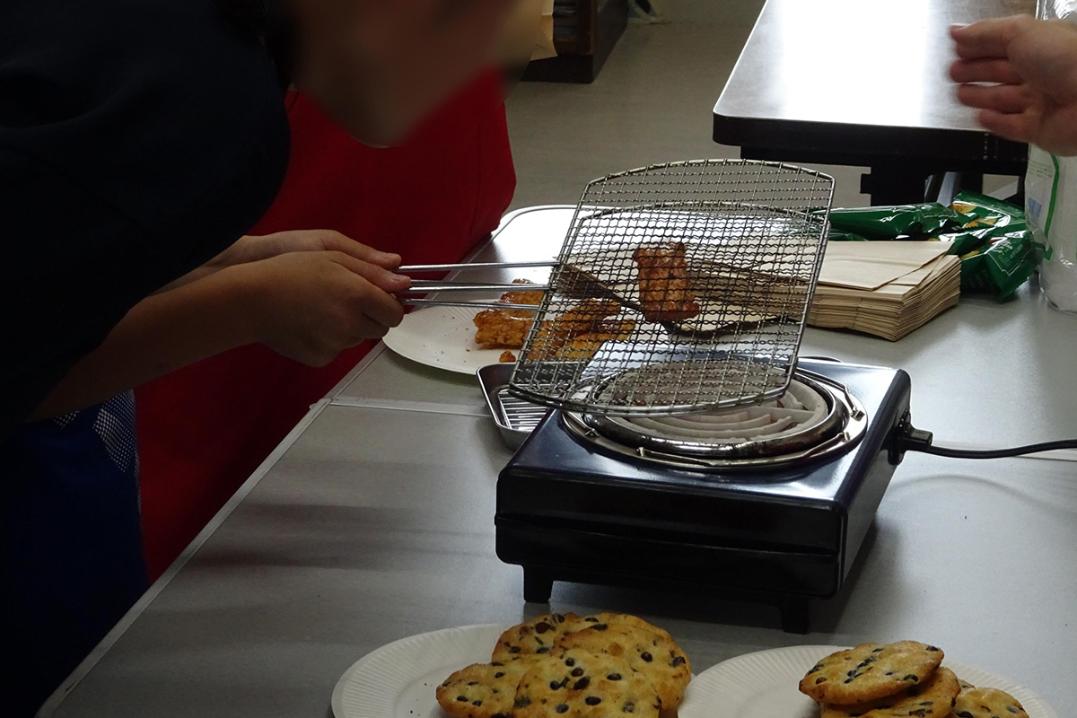- おかきは少しデコボコしていたから、あみではさんで焼くのがむずかしかったけど、楽しかったです。また、焼きたてだったので、食べてみたらおいしかったです。