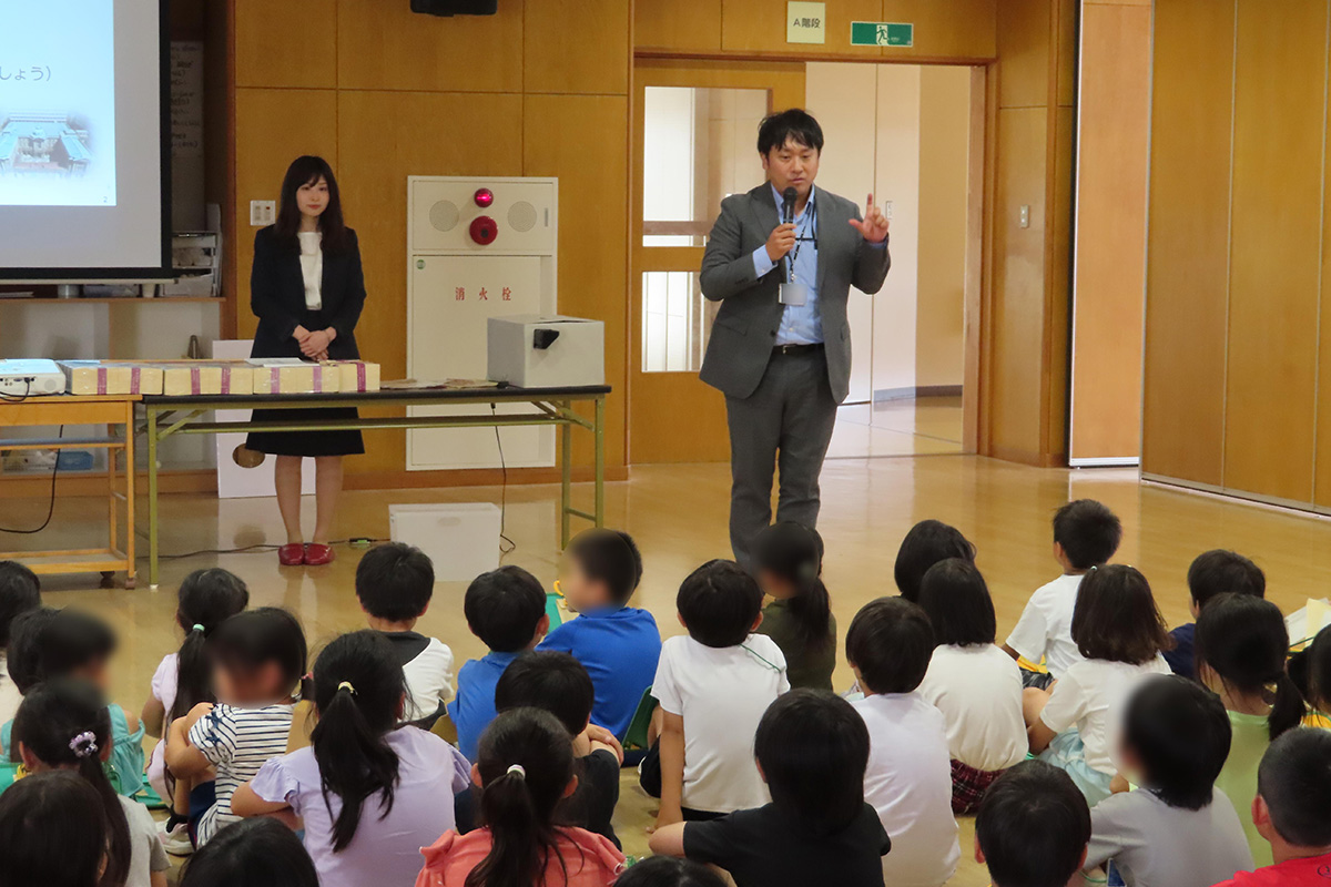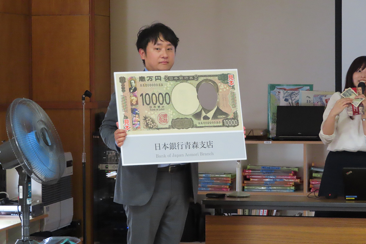 お金について、「昔のお札は何で作られていたか」、「現在、日本で使えるお札は何種類あるか」などお札に関するクイズを通して学んだ。また、「なぜ、お札を新しくするのか」や「新しく発行されるお札のヒミツ」について話された。お札はどこで作られるのか、作られたお札がどこへ行くのか。そして、古くなったお札がどうなるのか、お札の一生(たび)について理解を深めた。1千万円のお札の束と1億円のお札の束を持って重さを比べたり、お札の特殊インクが光る様子を確認したり、体験活動も行った。