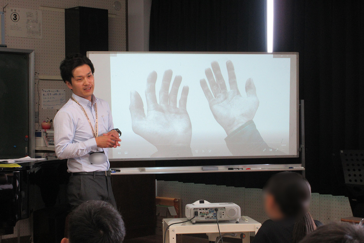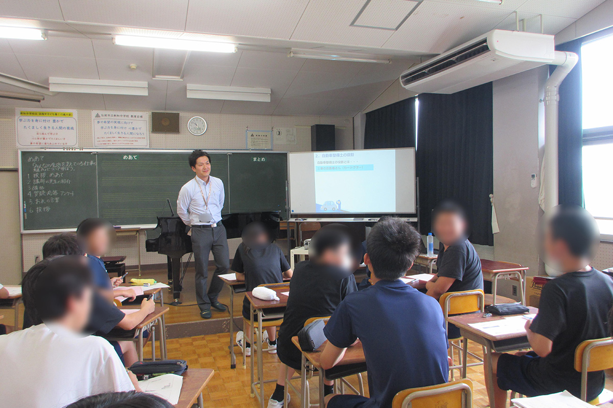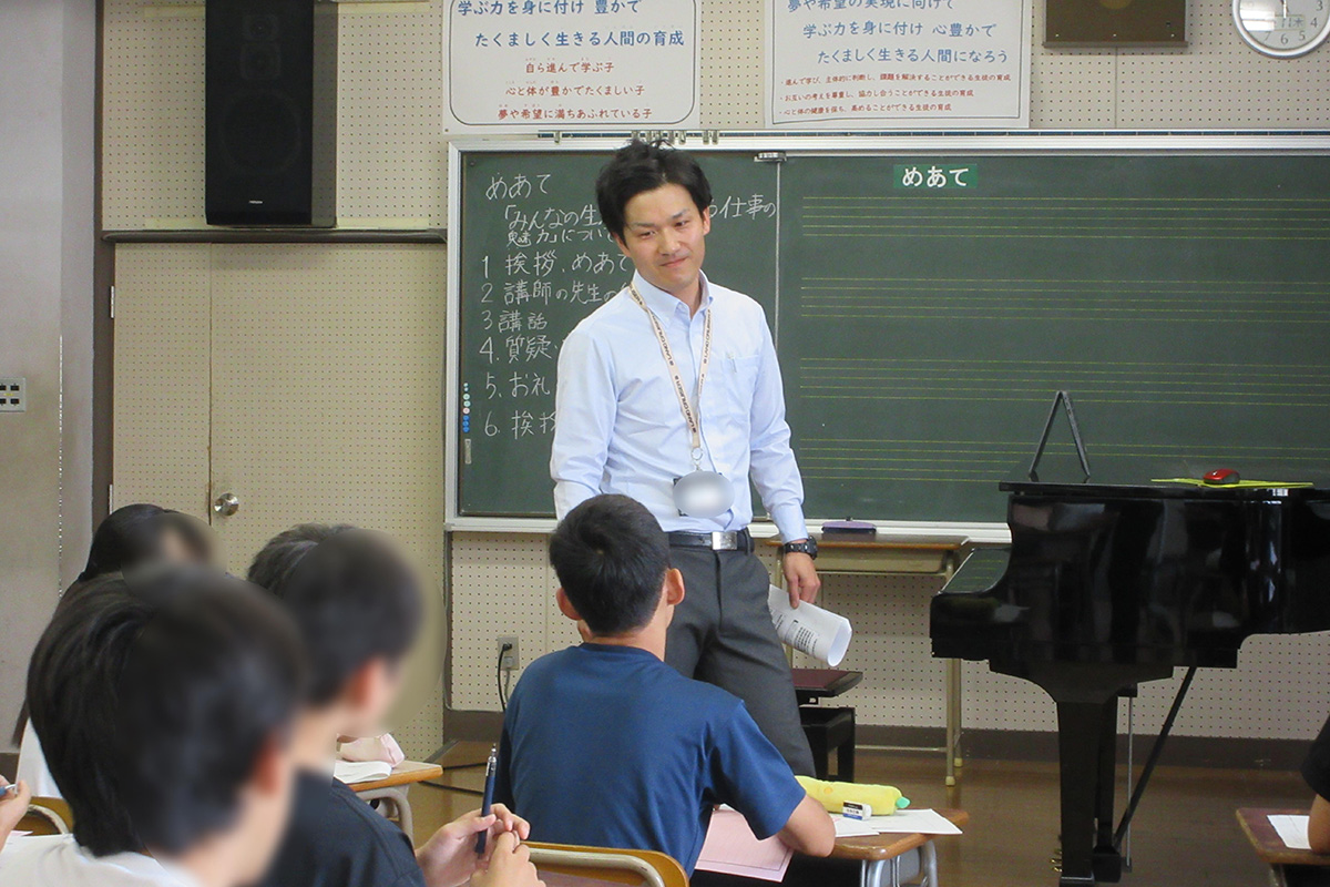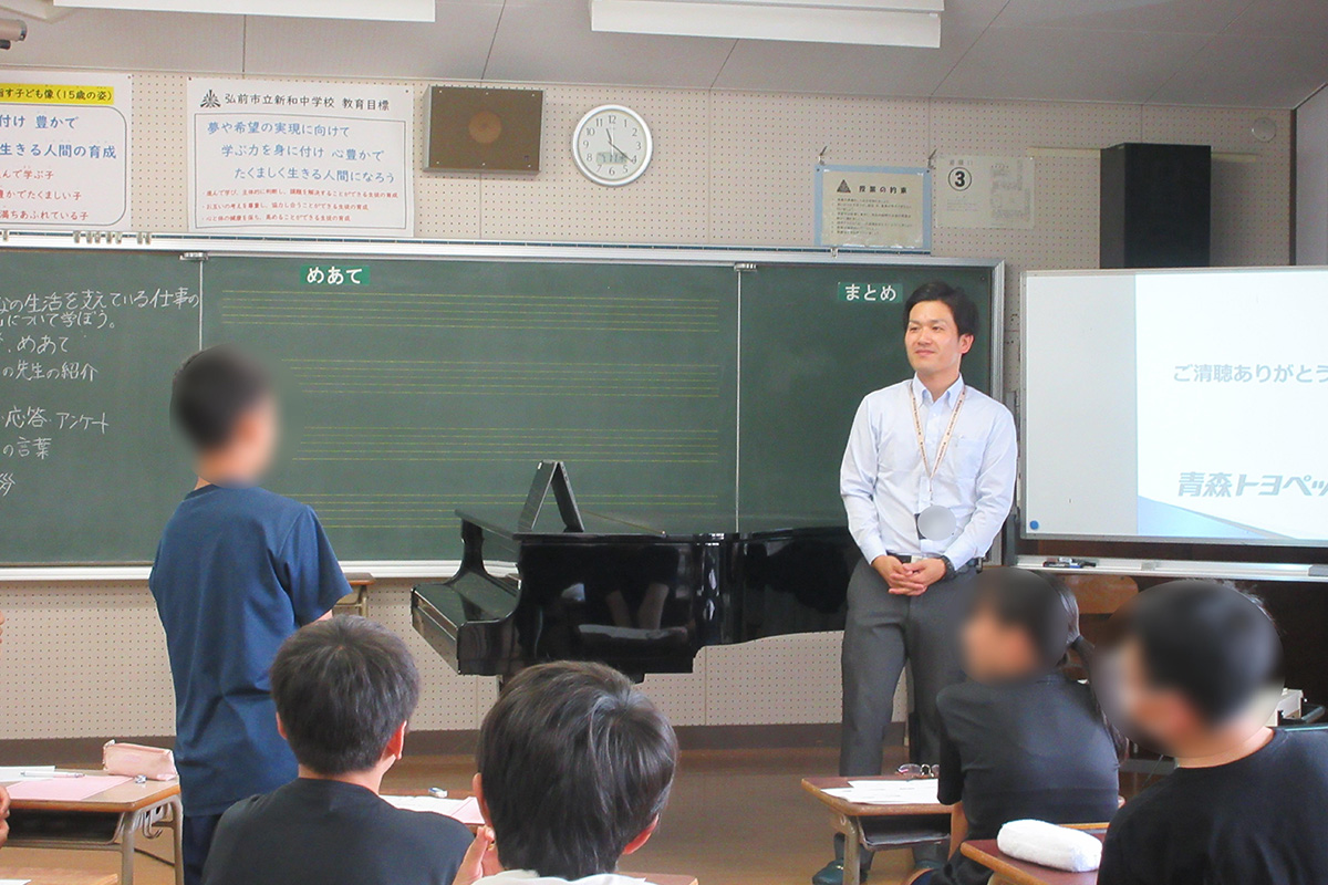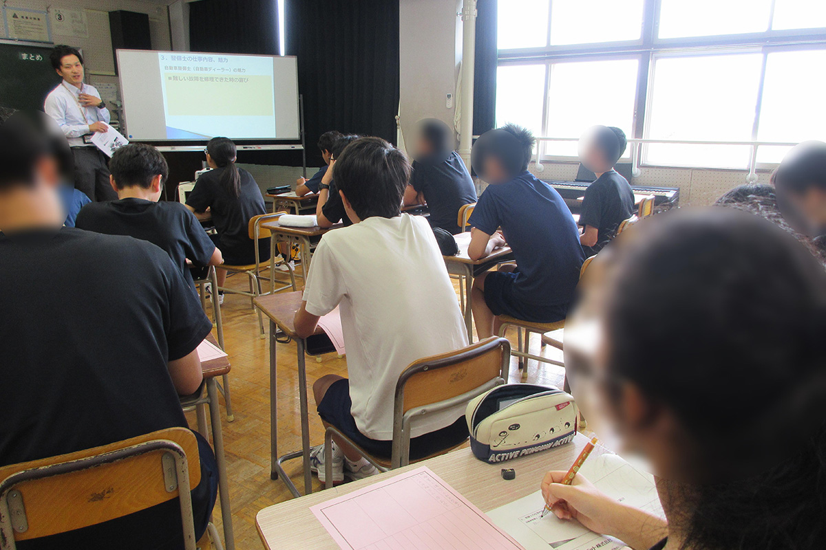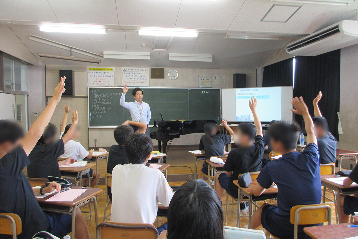 10月に実施される「職場体験」に向けて、働く意義や社会に出る前の心構え等について知り、自己の生き方について考えていくため、職場体験事前学習として「みんなの生活を支えている様々な仕事の魅力について知ろう」を実施。自動車整備士には、自動車の全ての故障に対して正確な整備を行う「車のお医者さん(カードクター)」と、機能の使い方など自動車にかかわることについてアドバイスを行い、快適で安全なカーライフをサポートする「お客様のカーライフアドバイザー」の2つの役割があることを理解した。点検整備や消耗品の取換え、故障診断、商品の説明や走行アドバイスなど、具体的な仕事内容を学んだほか、自動車整備士の1番の魅力は、お客様の笑顔であると話された。