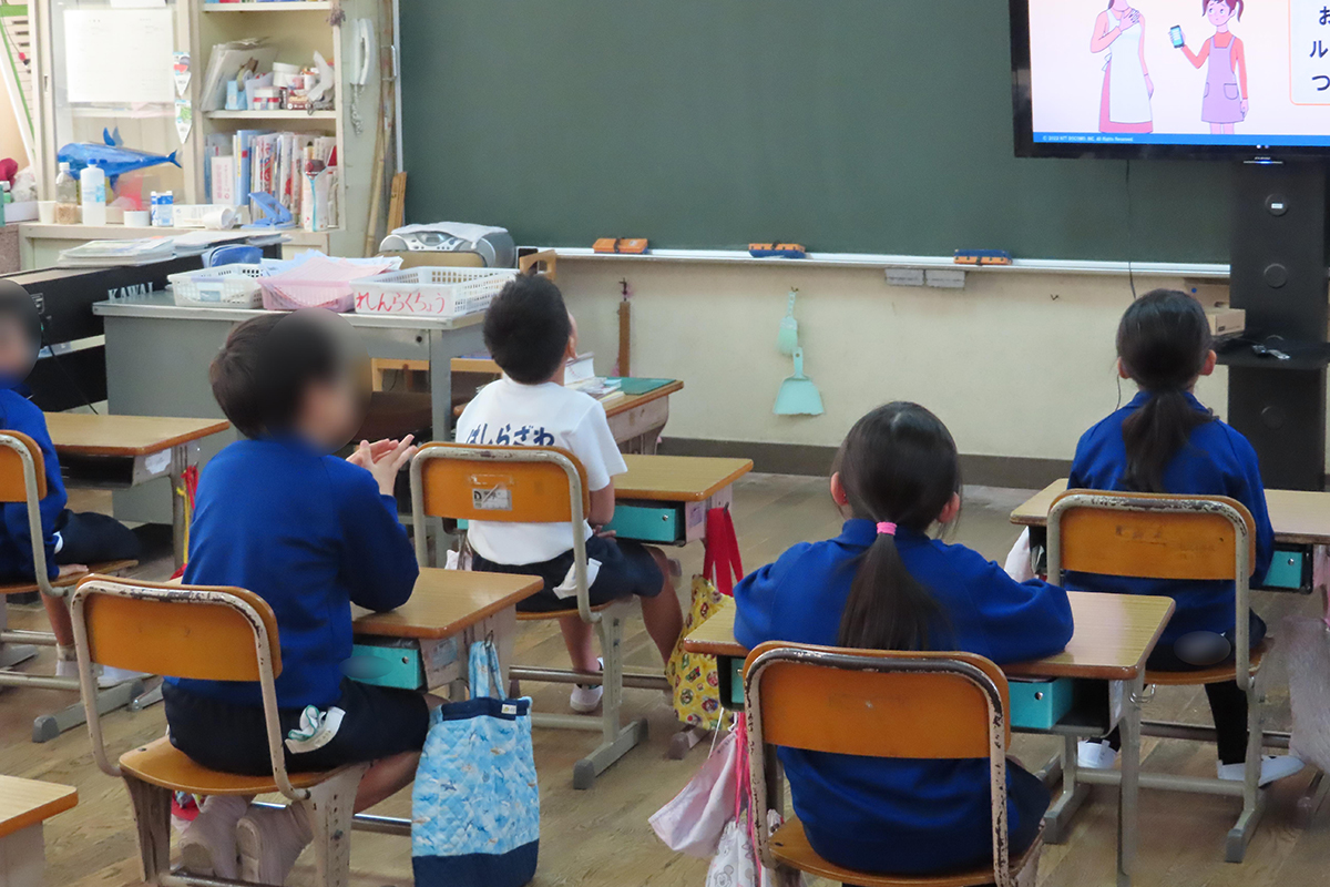 スマホ・インターネットの使い方について、動画(アニメーション)を用いて学習した。スマホではどんなことができるかを考え、まちがった使い方をするといやな思いをすることもあることなど、ルールやマナーについて理解を深めた。また、歩きスマホやながらケータイはしない。使ってよい場所かを確かめる。カメラを使うときは撮ってもよいか確認するなどの守ることについて、〇×クイズを用いて学んだ。最後に、これから気をつけようと思ったことを発表し、クラスで共有した。