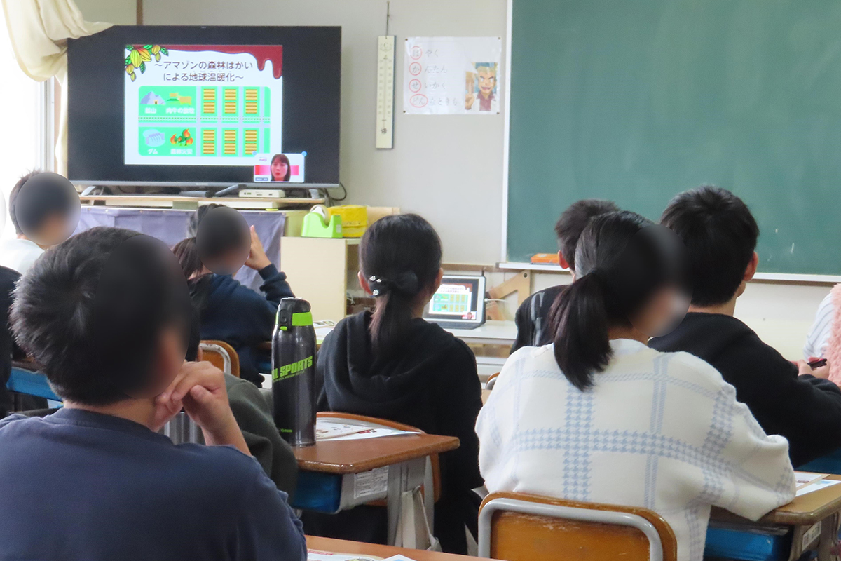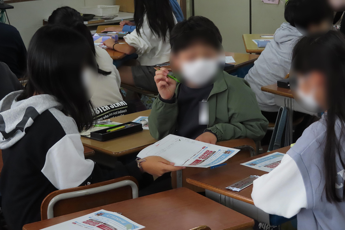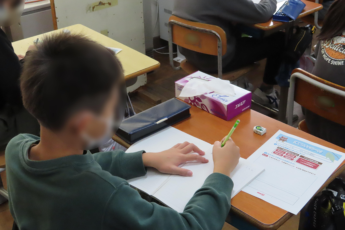 チョコレートの原料となるカカオの木や実がどのように育ち、カカオが日本に出荷されるまでにカカオ農家ではどのような作業があるのか、また、カカオが日本に到着してからチョコレートになるまでの工程について理解した。カカオの生産国について詳しく知るとともに、安全な飲み水が不足していることや病院・医師が不足していること、学校が足りないことなど、生産国の人々が困っていることを解決するために自分たちには何ができるのかを、ワークシートを用いて考え、発表した。カカオ産地と協力し合うために明治が取り組んでいることを通じて国際協力について考えた。