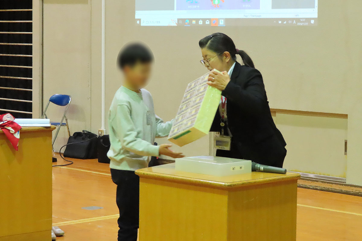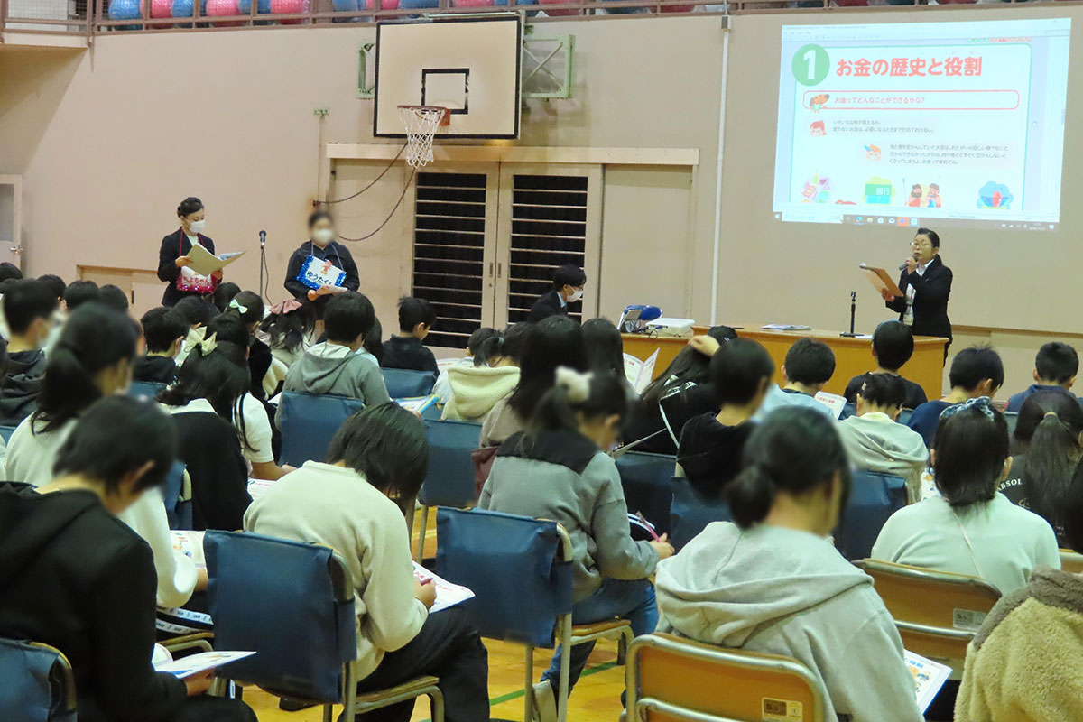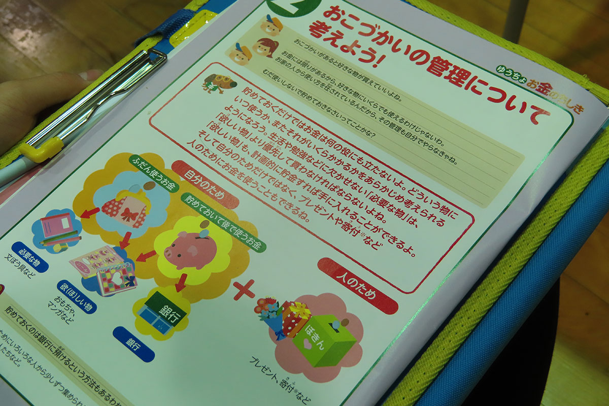 銀行の仕事やお金の歴史、役割(物やサービスと交換できる、貯めておける、物やサービスの価値を表す)について、クイズを交えて学習した。また、現金を持ち歩かなくてもスマートフォン等で買い物ができる「キャッシュレス決済」という支払方法があることを知り、その利便性と利用する際はお家の人とルールを決めることが大切であることを学んだ。お小遣いの使い方として、生活や勉強などに欠かせない「必要な物」を優先し、「欲しい物」や「人のため」にも使えるように、あらかじめ使い方を考えて計画的にお金を貯めることの大切さを学んだ。最後に、友だち同士でお金を貸し借りしてもよいかなど、お金に関するルールについて理解を深めた。
